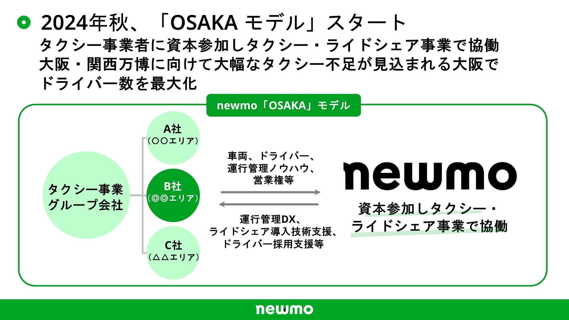 また、今回のパートナーシップについて、近隣エリアに複数のグループ会社を有するタクシー事業者がライドシェアへの参入を検討される際、グループ傘下の1社とnewmoが提携しライドシェア事業を開始する「OSAKAモデル」として、他地域でも同様のパートナーシップを通じたライドシェア事業を展開してまいります。