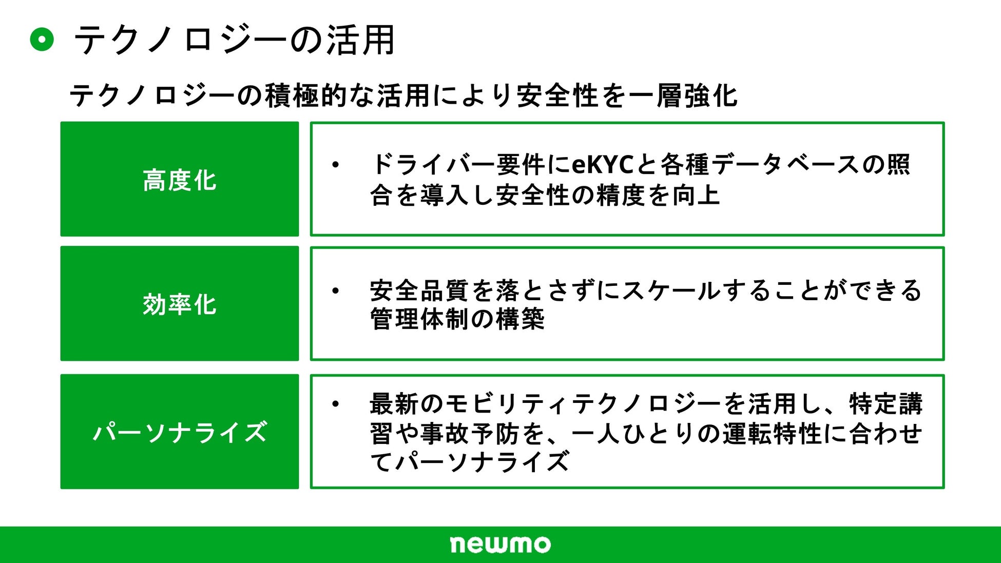 また、ドライバー登録時に最新のeKYC(オンライン本人確認)や、事故歴・違反歴・犯罪歴・反社チェック等に外部データベースを活用する「高度化」、特定講習や事故予防に最新のモビリティテクノロジーを使い一人ひとりの運転特性に合わせる「パーソナライズ」など、安全性の向上に向けたテクノロジーの活用も推進していきます。