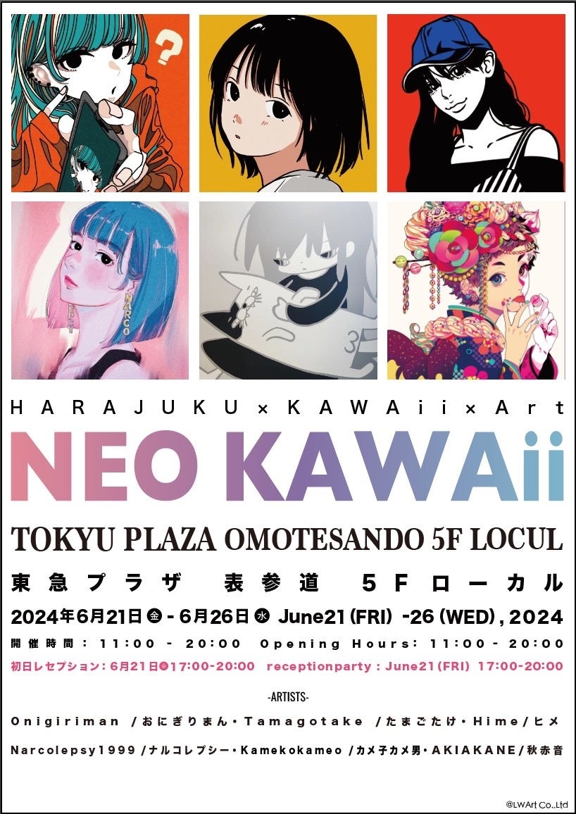 現代アートのグループ展・企画展を中心に展開する株式会社LWArt(本社:東京都大田区、代表取締役社長:小川 将司、以下「LWArt」)は、「東急プラザ表参道5F LOCUL(ローカル)」にて、総勢6組のアーティストによるグループ展「NEO KAWAii」を、6月21日(金)~6月26日(水)に開催。