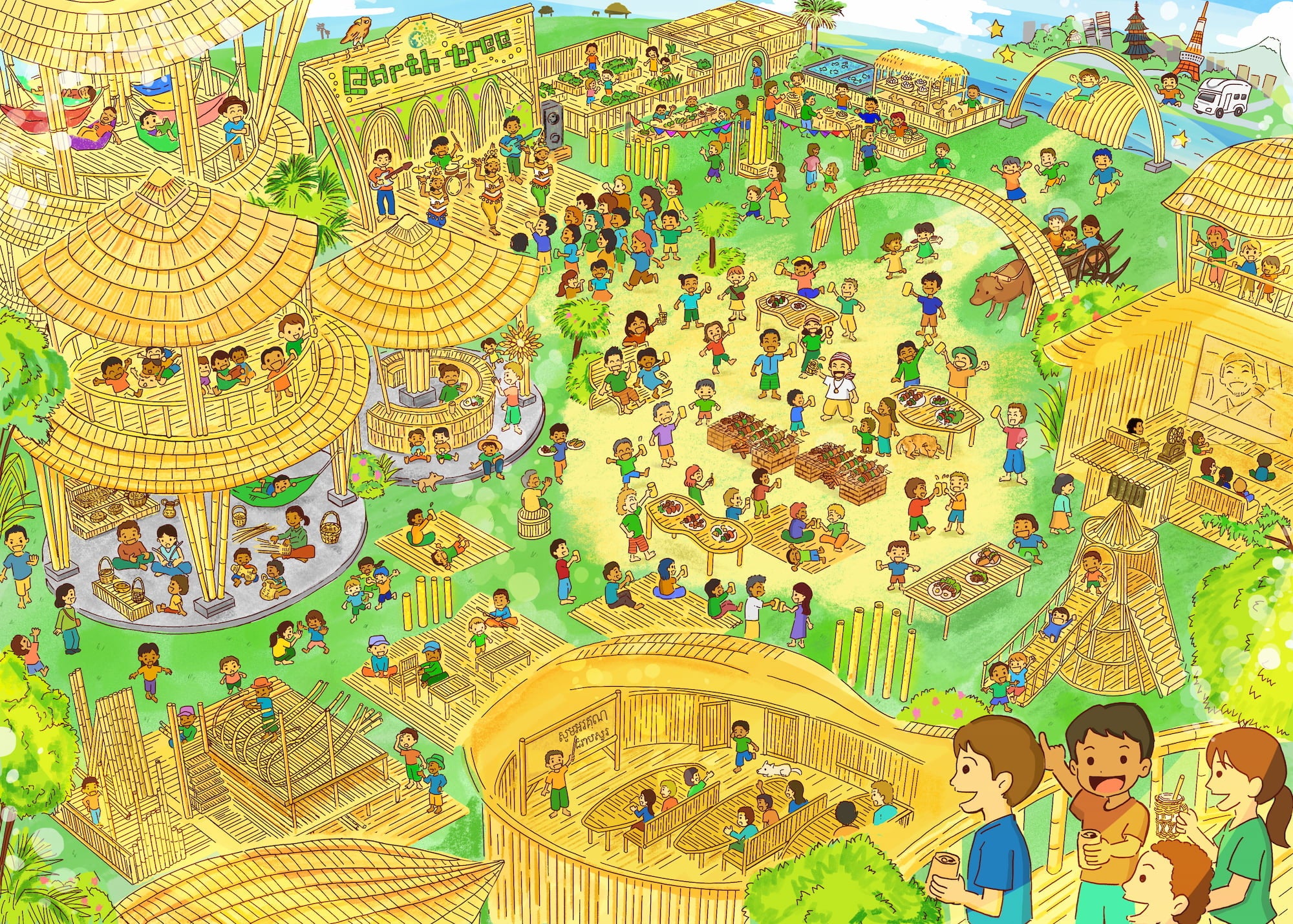 私たちearth treeは、「イキイキとワクワクのあふれる 笑顔がつながり続ける未来へ」をビジョンに掲げ、日本とカンボジアで教育・職業創出・地域活性化を推進するNPO法人です。カンボジア最大級の竹建築「earth treeビレッジ」を拠点に、学ぶ場所・働く場所を一体化させた、持続可能なコミュニティづくりを目指しています。