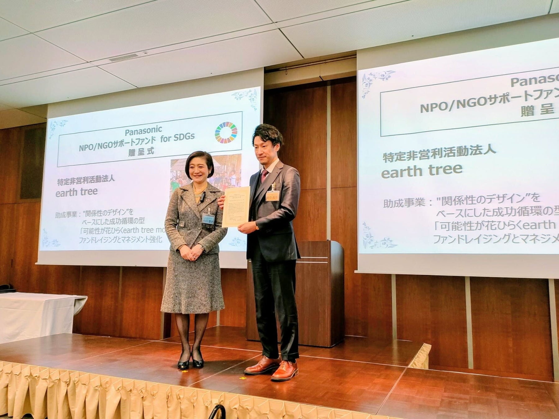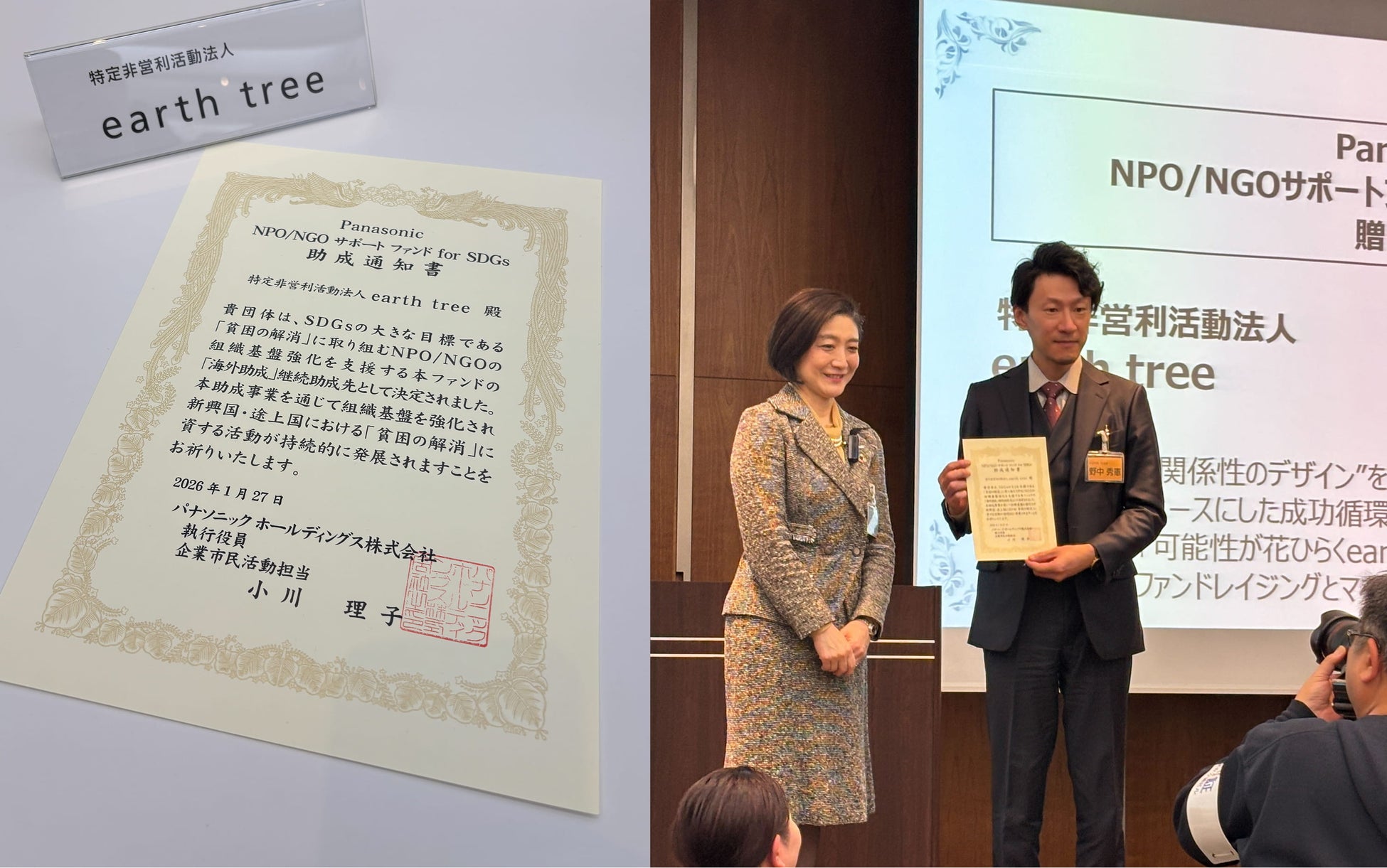 カンボジアで教育・就労支援を行うNPO法人earth tree(所在地:埼玉県春日部市、代表理事:加藤大地)は、パナソニック ホールディングス株式会社が運営する「Panasonic NPO/NGOサポートファンド for SDGs」の2026年度海外助成団体に採択され、1/27(火)に理事の野中・福井が東京 汐留で開催された贈呈式に参加しました。