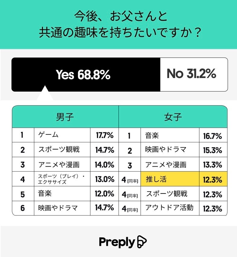 今後お父さんと持ちたい共通の趣味として、女子中高生の1割以上(12.3%)が、「推し活」をお父さんとの共通の趣味にしたいと回答。
