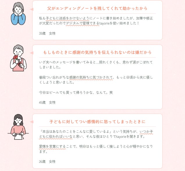 特に若い世代からは、「親が亡くなった際に準備をしてくれていて助かった」または「準備がなく大変な思いをした」という経験から、自分も早いうちに最低限の準備をしておきたいという声が寄せられています。また、「万が一に備えて子どもに言葉を残しておきたい」というニーズの高まりもあり、幅広い層に支持されています。