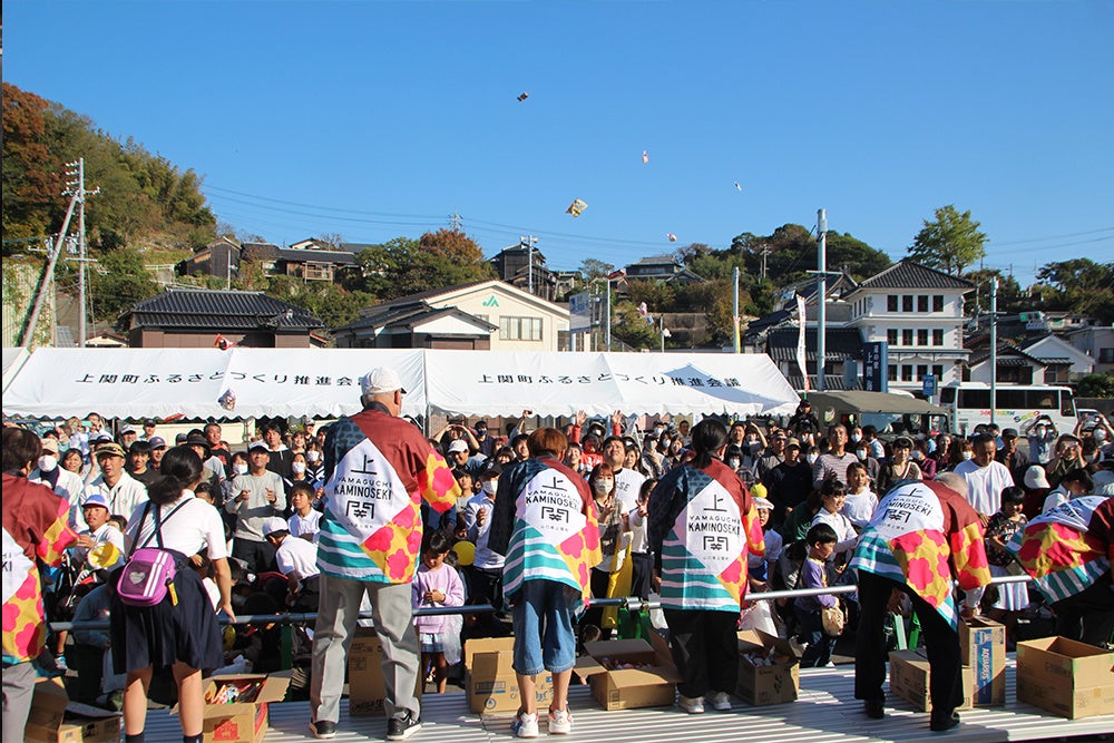 山口県といえば「もちまき」。愛・ランドフェアの最後はもちまきで締めます。小餅とお菓子、最後は三合餅を豪快に撒きます。手に入れた人には幸運が訪れるかも…?