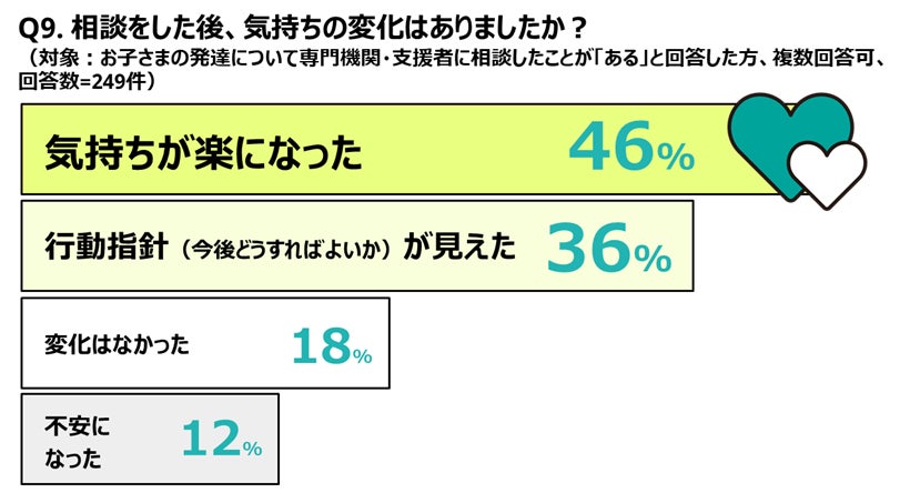 検査や診断を受けることについての考えについて聞く質問では、8割以上が『積極的に受けたい・必要に応じて受けたい』と回答しており、実際に「相談をした後、気持ちの変化はありましたか?」という質問では、『気持ちが楽になった』『行動の指針が見えた』という回答が目立ちました。専門職や支援者に相談することは、否定的な印象よりも、「子どもをより深く理解するためのプロセス」だと捉える姿勢がうかがえます。
