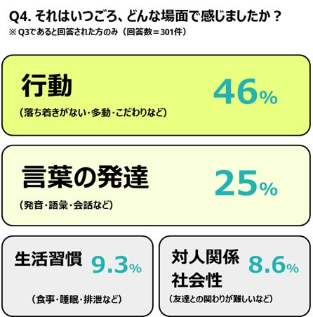 また、こうした経験が「ある」と回答した方のうち「すぐ相談した」と答えたのは約7割に上り、気づきを行動に移す保護者も多く見られました。この質問に付随して、「どんな場面でそう感じたか」という問いには、「対人関係・社会性」「生活習慣(食事・睡眠・排泄など)」に関する回答が約半数を占めと、日常生活のごく身近な場面で“気づき”が生まれていることが分かります。