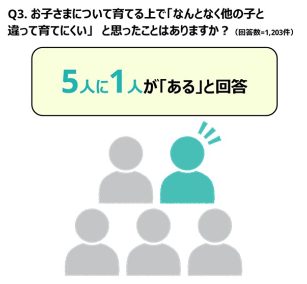 一方、「お子さまについて育てる上で『なんとなく他の子と違って育てにくい』と思ったことはありますか?」という問いではなんとなく違う・育てにくさを感じた経験があると回答した保護者は5人に1人という結果になりました。一見少ないように見えますが、5人に1人の保護者が「違和感」や「育てにくさ」を感じているという結果は、子どもの発達にまつわる悩みが誰にとっても起こりうる“身近なテーマ”であることを示しているのではないでしょうか。作業療法士として医療現場での支援を行う高畑先生は「保護者が『他の子と違うかも』と感じる違和感は、決して否定的なものではありません。日々の小さな変化に気づけるからこそ生まれる“理解の入り口”であり、そこから子どもの行動や感情の背景を理解していくことが大切。」と話します。