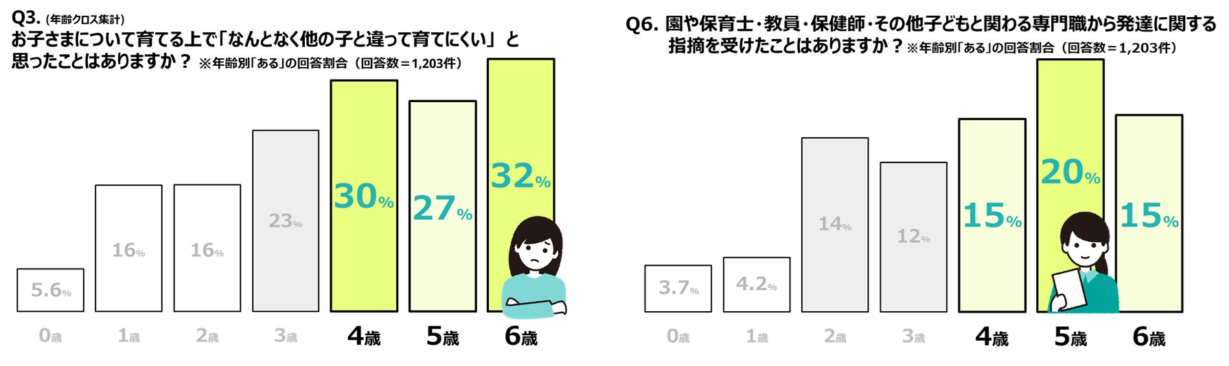 さらに、子どもの年齢別に見ると、“違いを感じる”割合は年齢が上がるほど増加する傾向が見られました。特に4〜6歳では平均して約3割が「他の子と違って育てにくいと感じたことがある」と回答しており、集団生活や他児との比較が増える時期に“気づき”が生まれやすいことがうかがえます。一方で、園や保育士・教員などから発達に関する指摘を受けた経験は、5歳が最も高く、就学を意識し始める時期に“専門家からの指摘”が増える構造が見られました。これは、保護者自身の気づきと園側の観察の両方が、子どもの変化をとらえる契機となっていることを示しています。