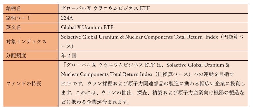 「グローバルX ウラニウムビジネスETF」(224A)の商品詳細はこちら |