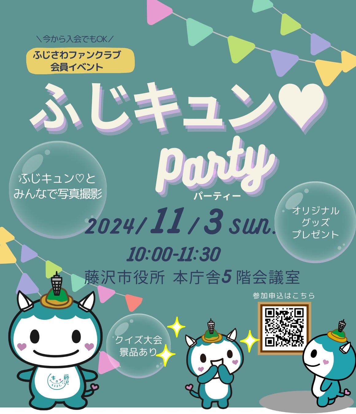 パーティーでは、会員から寄せられた「ふじさわクイズ」大会や、会員の活動内容紹介の場も設けられ、ふじキュン♡と会員が楽しく交流する場となる予定です。