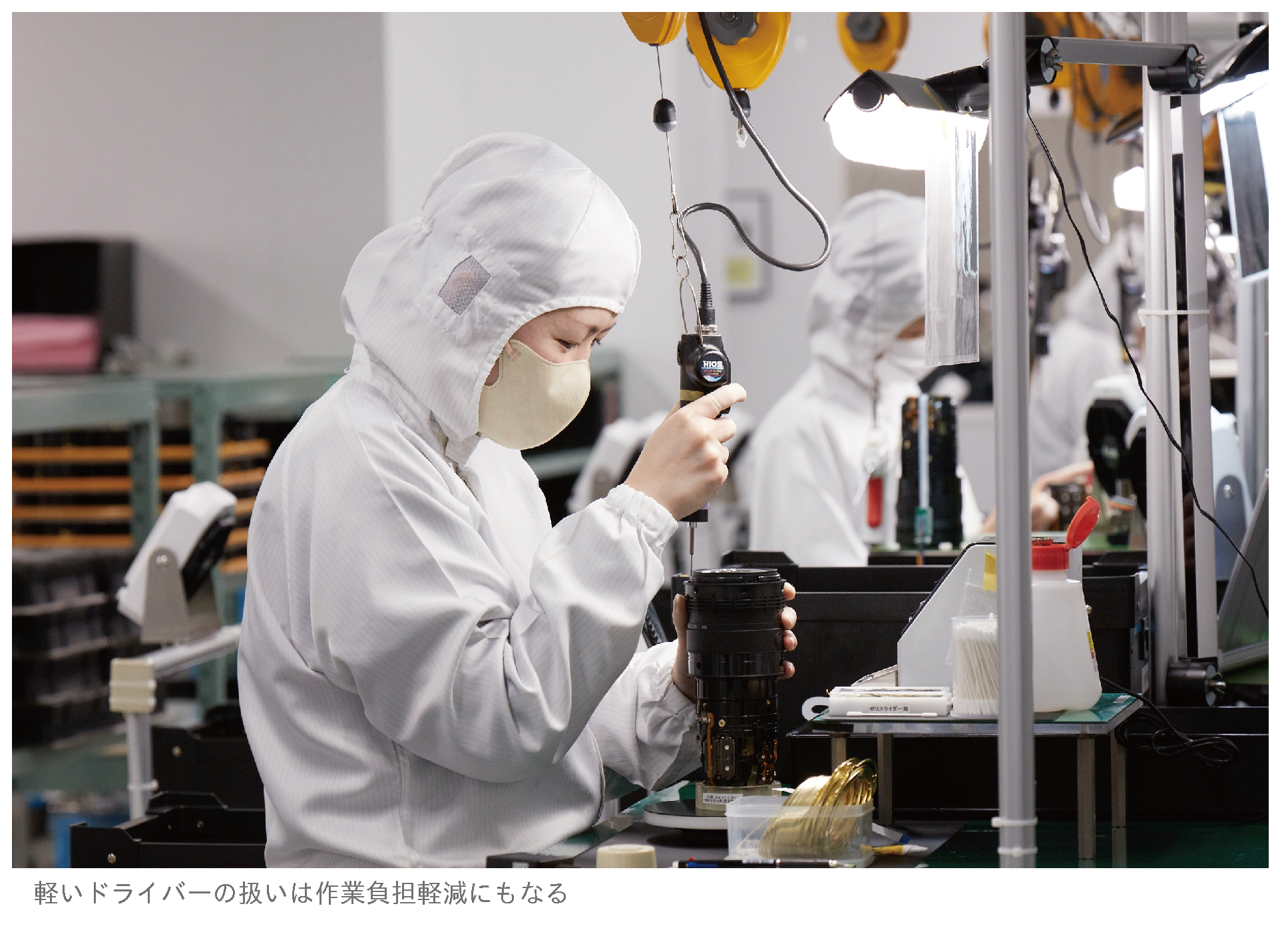 その組み立て現場で作業者の片腕となっているのがハイオスの電動ドライバーだ。交換レンズ1本の組み立てに20種類以上、60本を超えるねじが使われ、その締め付けの品質は同工場が国内外に送り出す製品の品質へとつながっている。