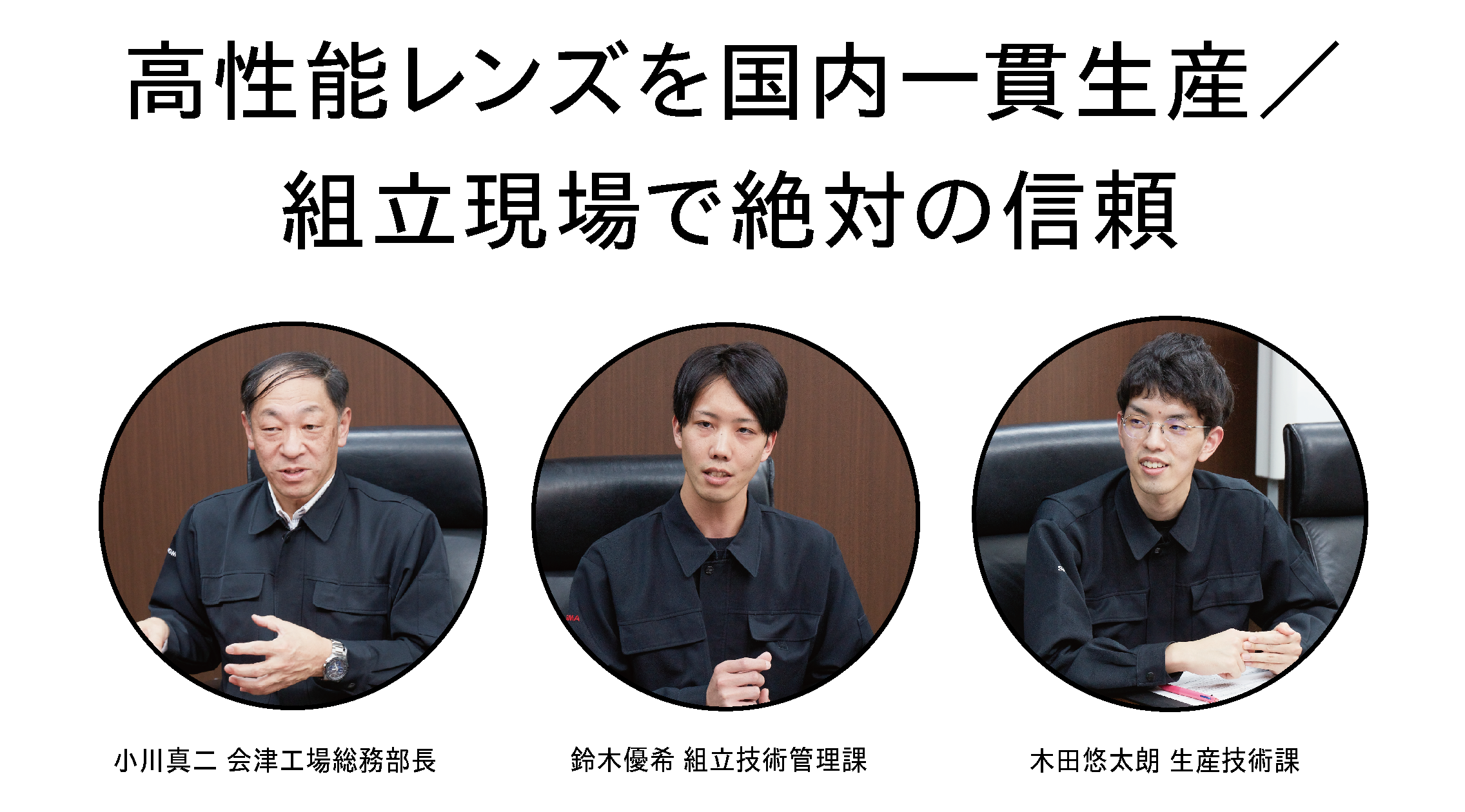 山木 レンズやカメラ全84モデルのすべてを福島県磐梯町にある会津工場で製造しています。これまで度重なる円高やリーマンショックといった不況においても雇用を守り、また付加価値の高い製品を製造したいと国内生産にこだわってきました。いまではレンズ加工のみならず、プラスチック成型、マグネシウム加工、塗装、基板実装、製品組立、金型や微小な金属部品の加工までほぼ自前でできる最高水準の力をつけるまでになったと思っています。