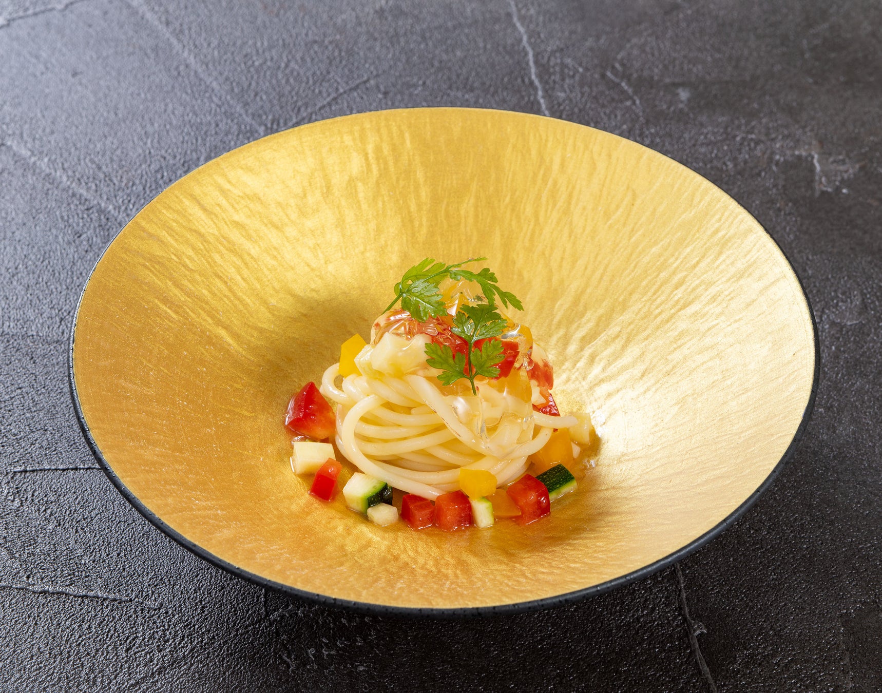 前菜:胡麻香る至福の豆腐、雲丹添え(胡麻豆腐)、湯葉のお刺身、彩り野菜の冷製パスタ