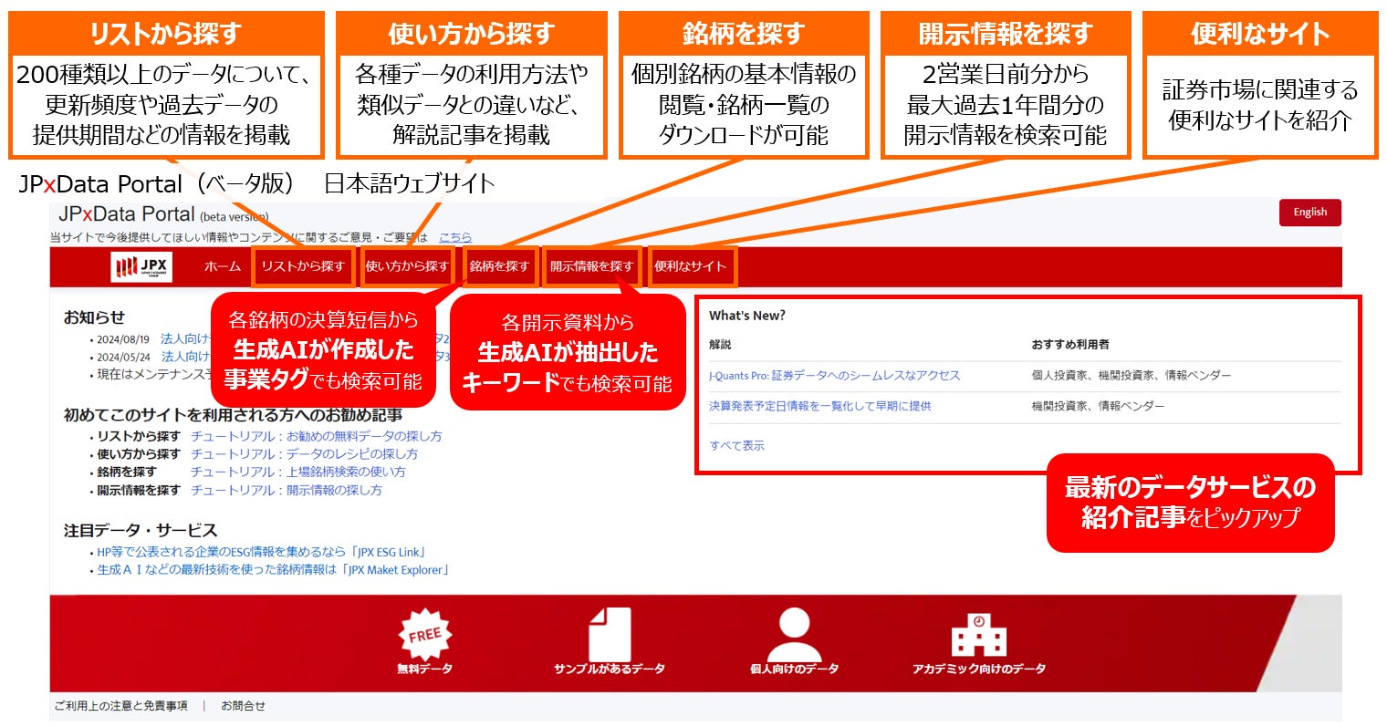 株式会社日本取引所グループ(以下「JPX」)のグループ会社である株式会社JPX総研(本社:東京都中央区、代表:宮原 幸一郎)は、JPX、JPXのグループ会社及び協業会社(以下「JPXグループ等」)が保有するデータを網羅的にカタログ化して紹介するポータルサイト「JPxData Portal(ベータ版)」(https://clientportal.jpx.co.jp/)(以下「本サイト」)の提供を開始しました。