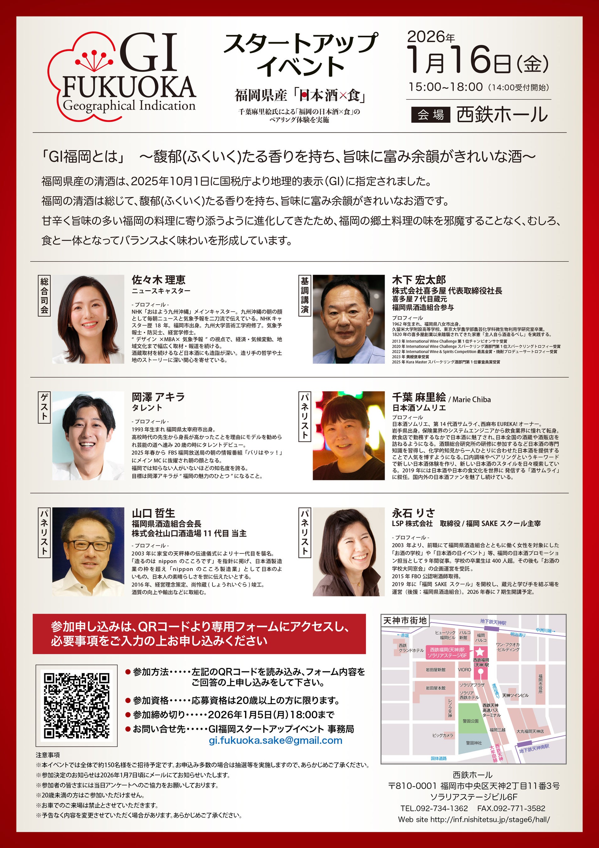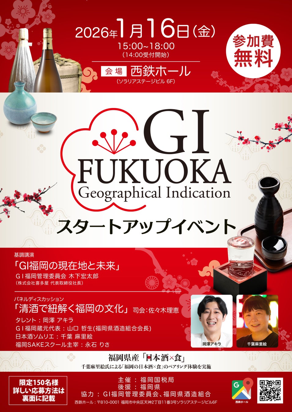 ゲストにタレントの岡澤アキラさんを迎えたパネルディスカッションを実施するほか、日本酒ソムリエの千葉麻里絵さん監修による「福岡の日本酒と食のフードペアリング」も体験していただけます。