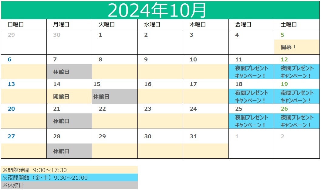 (ただし、10月14日[月・祝]、11月4日[月・休]、2025年1月13日[月・祝]、2月10日[月]、2月11日[火・祝]は開館)