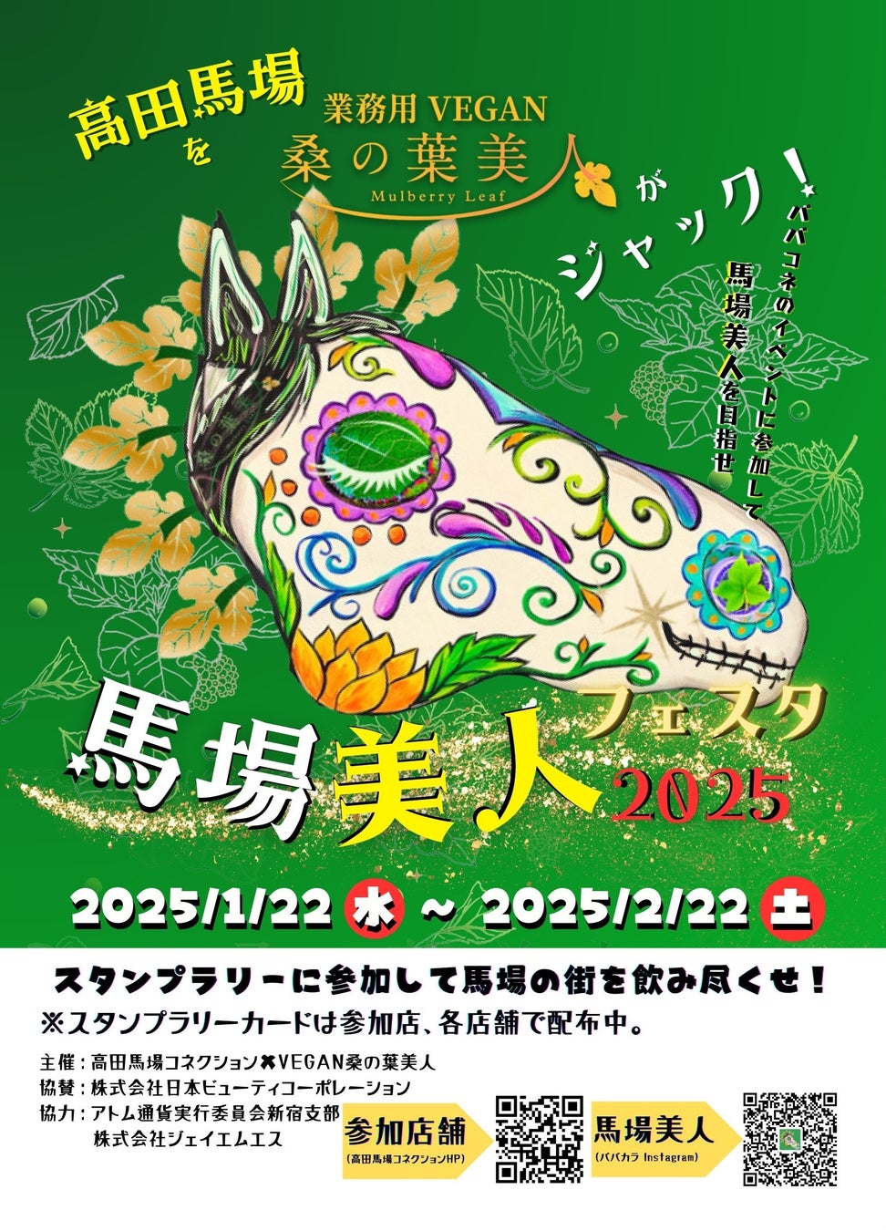 株式会社日本ビューティコーポレーション(所在地:東京都千代田区、代表取締役社長:力石 徹)は、高田馬場コネクション((高田馬場戸塚料理飲食業組合)所在地:東京都新宿区、広報部長:北中 知己)と共同で、美容青汁「業務用VEGAN桑の葉美人」を使用したソフトドリンク、アルコールを参加飲食店舗で提供し、街を巻き込んだイベントを開催します。