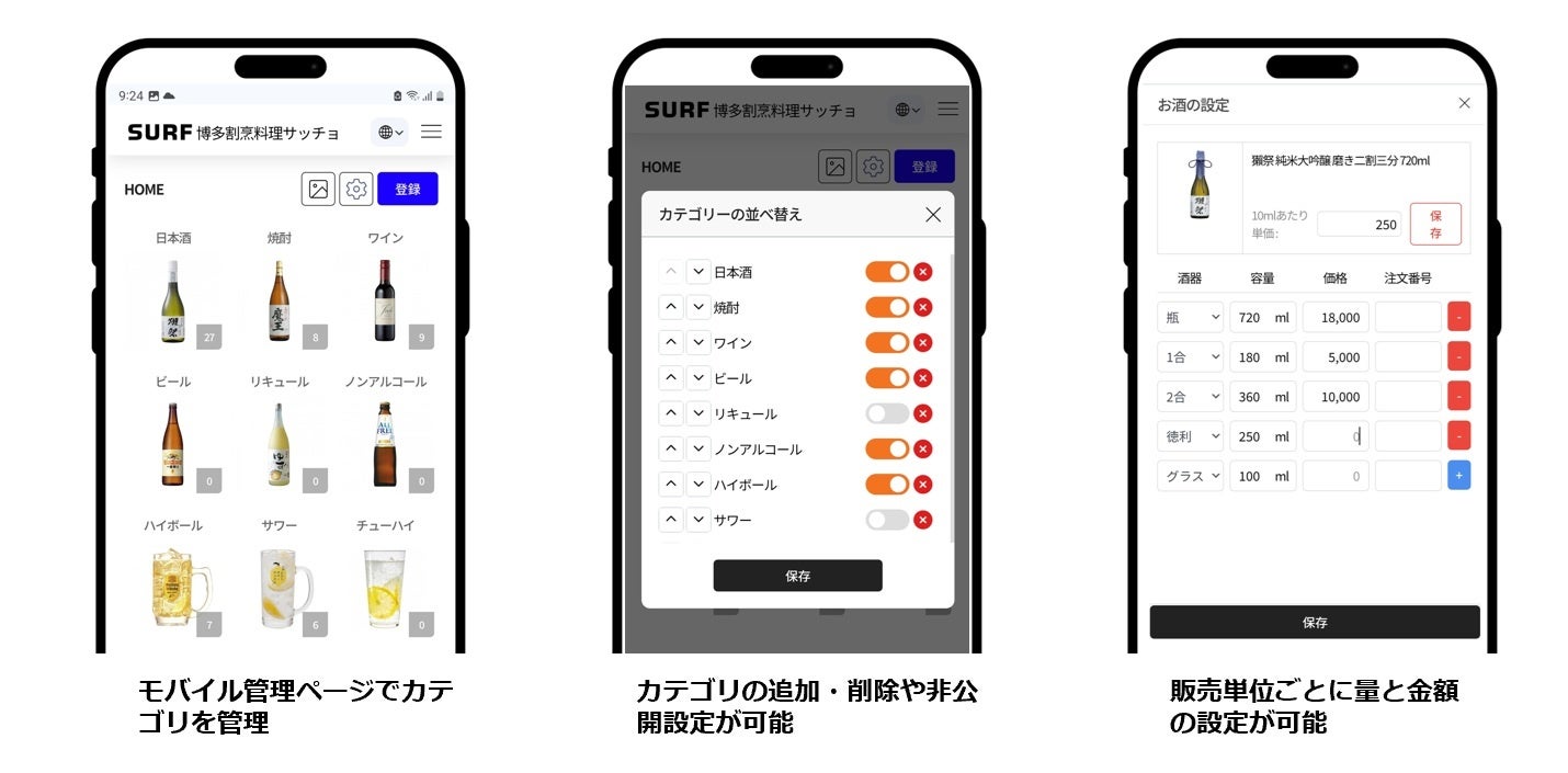 飲食店には、パソコンおよびモバイル対応の管理画面をご提供しており、店舗側で日本酒や焼酎を検索して直接登録し、販売単位や価格を自由に設定することが可能です。売切れとなった酒類については、「非表示」または「売切れ表示」に切り替えることができ、さらに店舗おすすめの商品には「おすすめマーク」を表示することもできます。