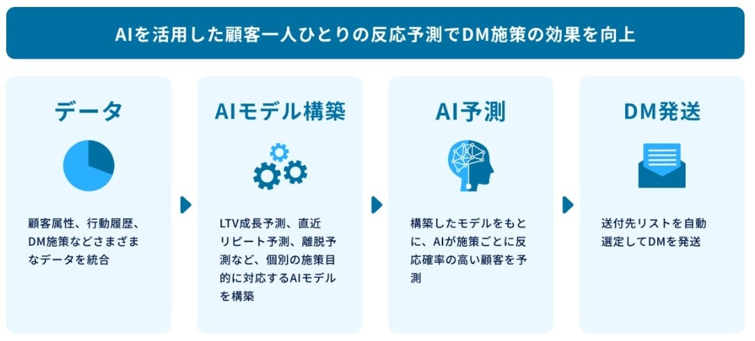 DMの送付先を顧客一人ひとりの反応確率で選定することで施策の効果を向上できるよう、顧客属性や行動履歴などさまざまなデータを統合し、個別の施策目的に対応するAIモデルの構築と反応確率の高い顧客のAI予測を実施することで、DM施策の効果を向上するサービスをご提供しています。