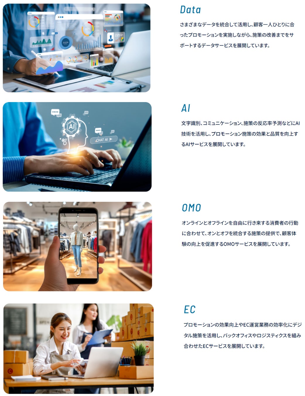 デジタル化が急速に進む現代、消費者の行動は多様化し、デジタルとリアルの垣根を超えた、多角的なコミュニケーションが必要となっています。当社は、提供するダイレクトメール・物流・セールスプロモーション・イベントのサービスとデジタルを融合することで、企業の課題解決、コミュニケーションの最適化、暮らしやすい社会の実現に貢献するデジタルサービスを提供してまいります。