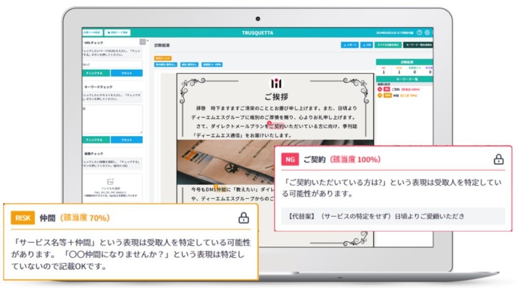 トラスクエタレターとは、DMの画像データをアップロードするだけで、郵便法及び信書便法に規定されている信書の表現をAIが自動で判別し、該当度や代替文言の提示を瞬時に行ってくれるクラウドサービスです。