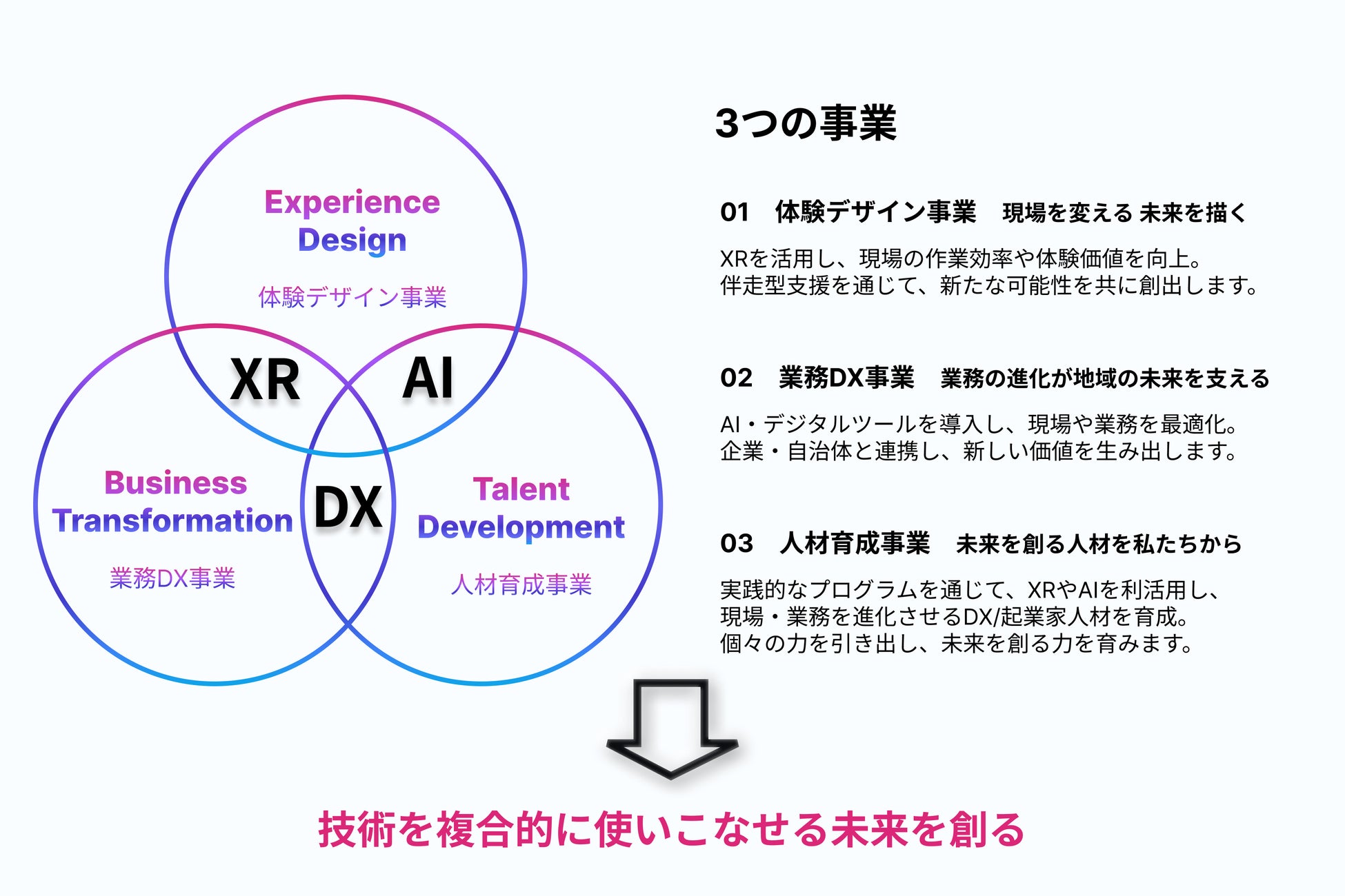 これまで弊社は、産業DXの推進とXRの認知拡大・研究に取り組んできました。しかし、XRを本格的に社会へ定着させるためには、「技術の発展」だけでなく「それを実装できる人材と環境」が必要です。