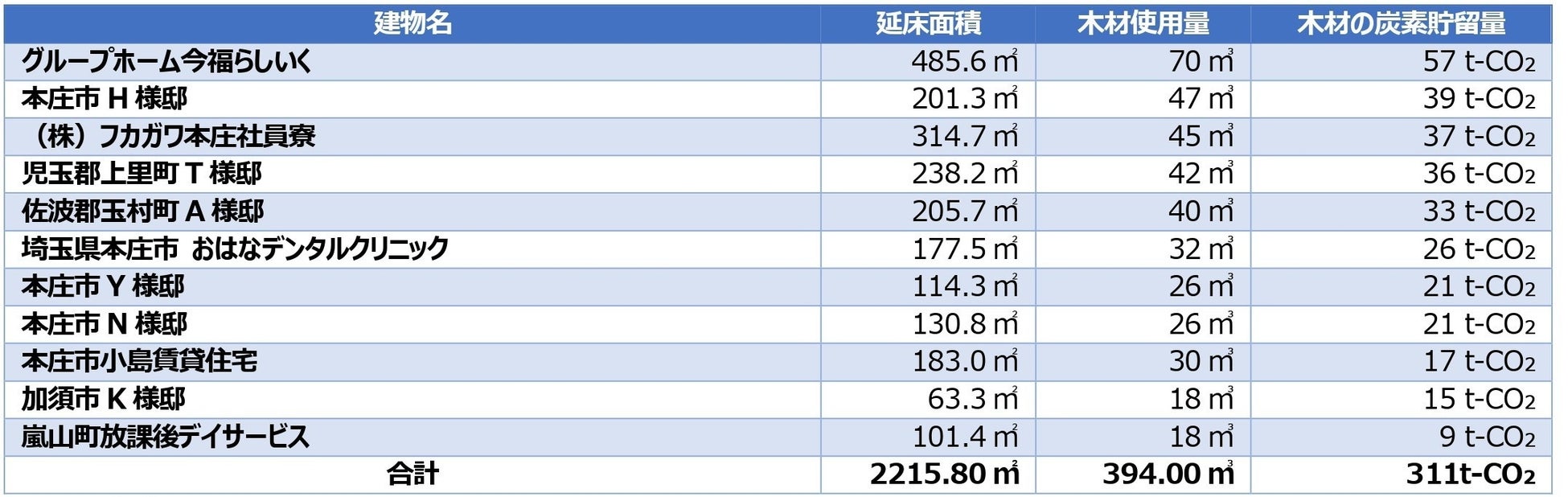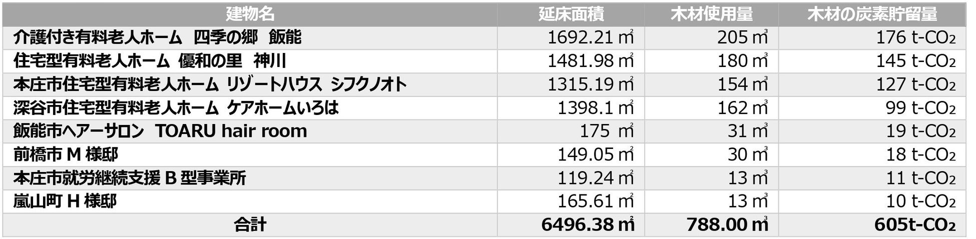 ※林野庁「建築物に利用した木材の炭素貯蔵量の表示ガイドライン」 (令和3年10月1日付け3林政産第85号林野庁長官通知)に準拠し、八木建設の木造建築物に利用した木材が貯蔵している炭素(CO₂換算)の量を示すものです。木材は、森林が吸収した炭素を貯蔵しており、木材を建築物等に利用していくことは、「都市等における第2の森林づくり」としてカーボンニュートラルへの貢献が期待されています。