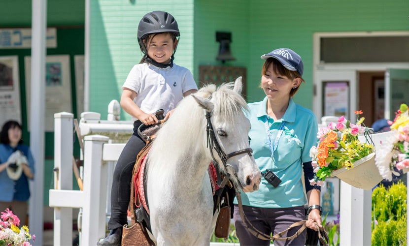 可愛いポニーに乗ろう♪小さなお子様から挑戦できるポニー乗馬と餌やり体験です。