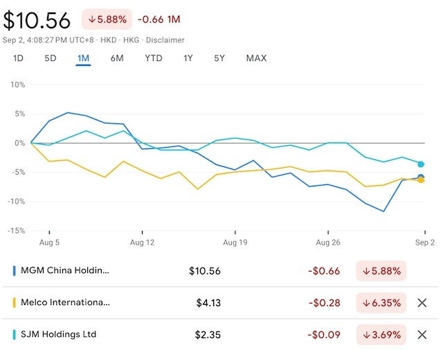 調査対象の「MGM China Holdings Ltd」は1ヶ月間で5.88%、Melco International Development Ltdは6.35%、SJM Holdings Ltdは3.69%の株価下落を示しており、短期的な不安定さが浮き彫りになっています。