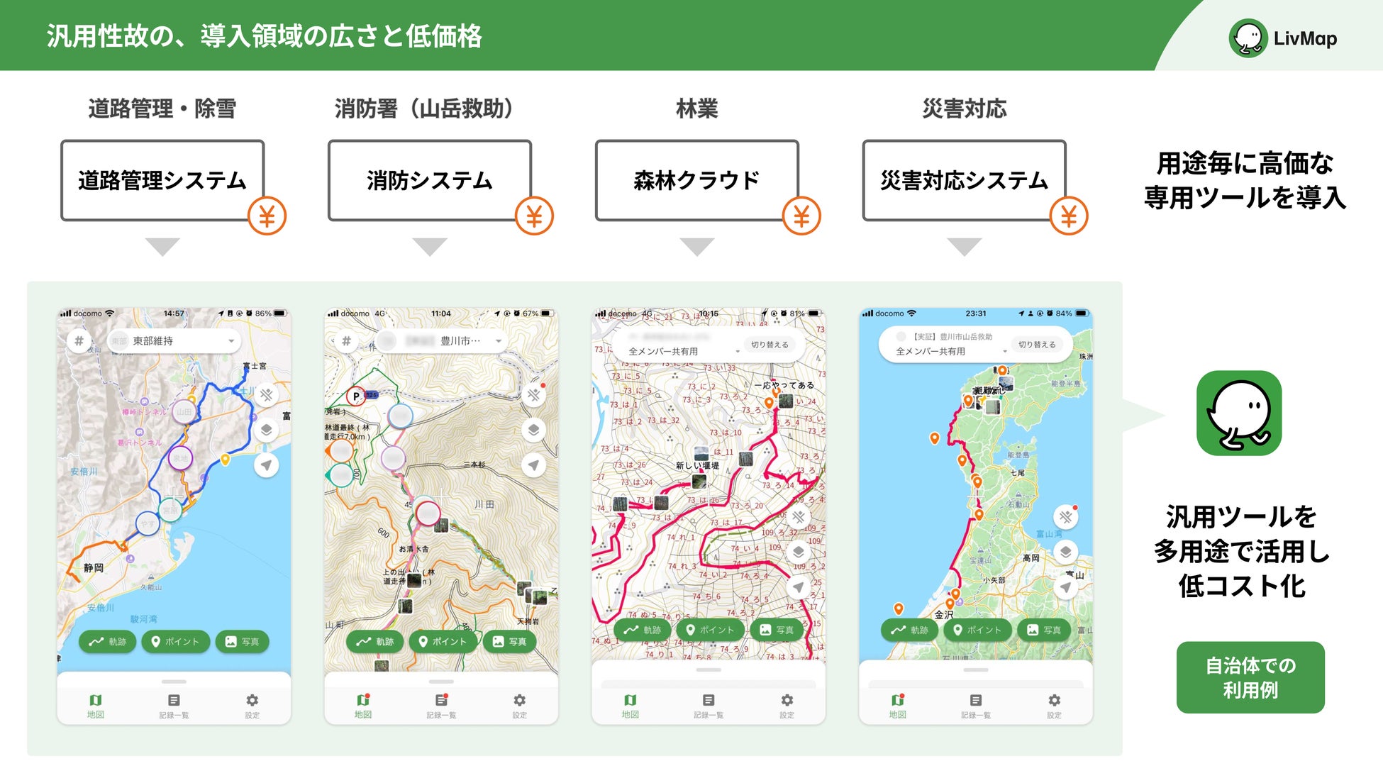 LivMapは災害時のみならず、道路管理・除雪、消防・救助、林業など様々なシーンで活用いただいています。従来は高価な専用ツールが用途ごとに必要でしたが、LivMapでは一つの汎用ツールで対応でき、コスト削減が可能です。
