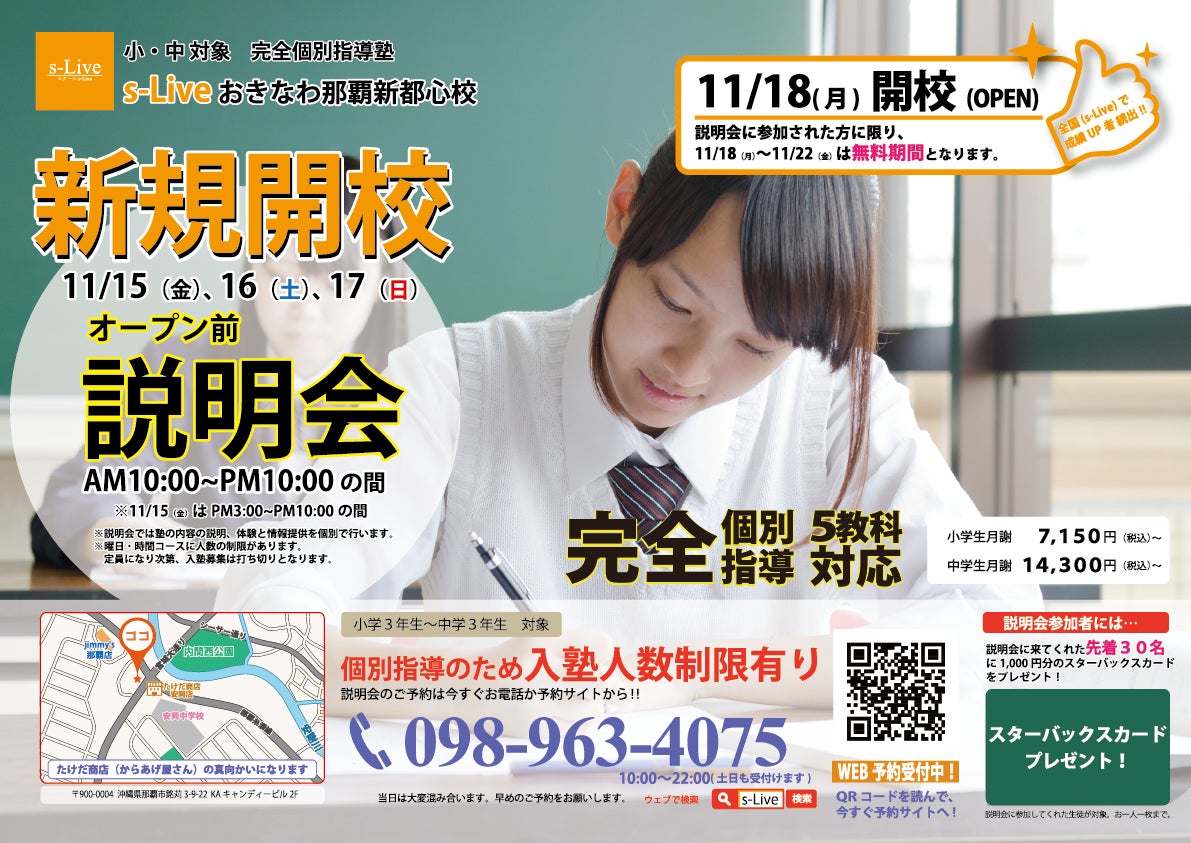 個別指導塾s-Liveは11月18日、沖縄県初となる新規校舎を那覇市にオープン。11月15日~17日の3日間で開校前説明会を開催する。