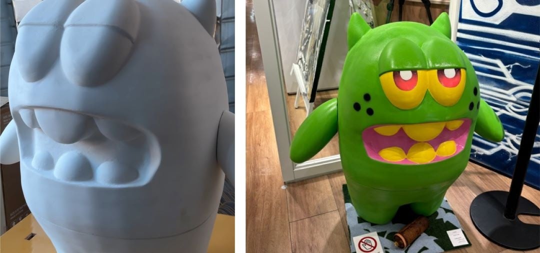 高さ15cmほどのフィギュアを約90cmに拡大するために3Dデータを作成し、5軸マシニングセンタで制作しました。5軸マシニングセンタを活用することで、従来は手作業で膨大な時間と労力を要した工程を効率化し、精密かつ迅速に仕上げることが可能です。さらに、データを保存することで同一デザインの量産にも対応。アートオブジェのようなユニークな作品から記念品の製作まで、幅広いニーズに応えています。