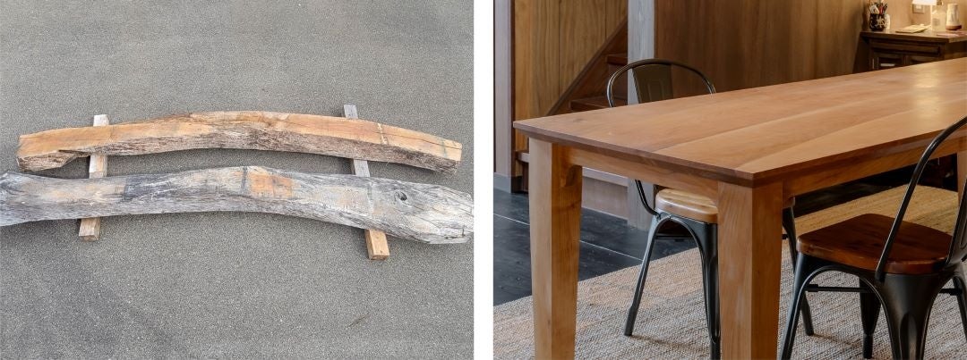 加工で生じた端材をアップサイクルし、新しい価値を生み出す取り組みを展開。異なる材質の木材を組み合わせ、一枚板のように見えるデザインテーブルを製作。無駄を最小限に抑える持続可能なアプローチで、素材の可能性を広げています。