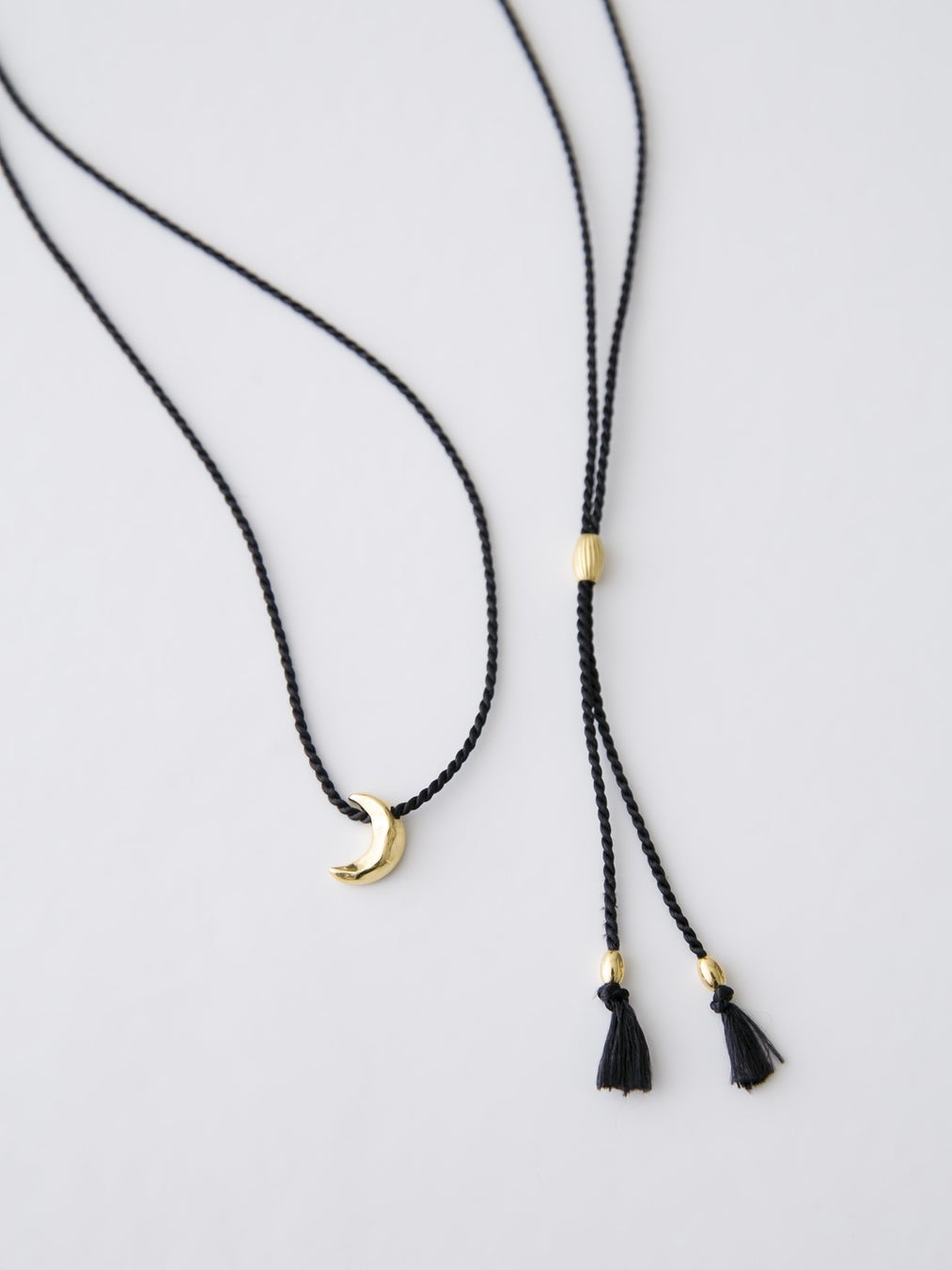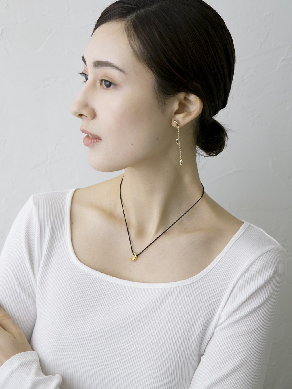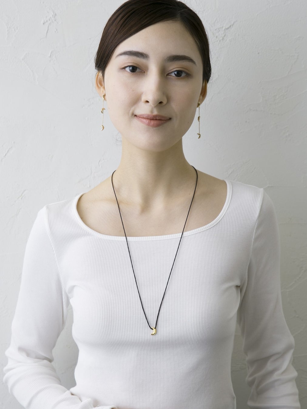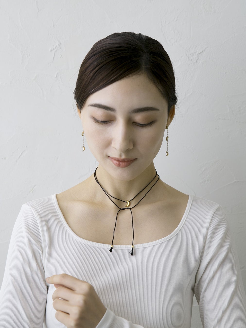 月のようなパーツをワンポイントに黒いシルクのひもでチェーンは使っていないので、金属アレルギーのある方も安心してお使いいただけます。