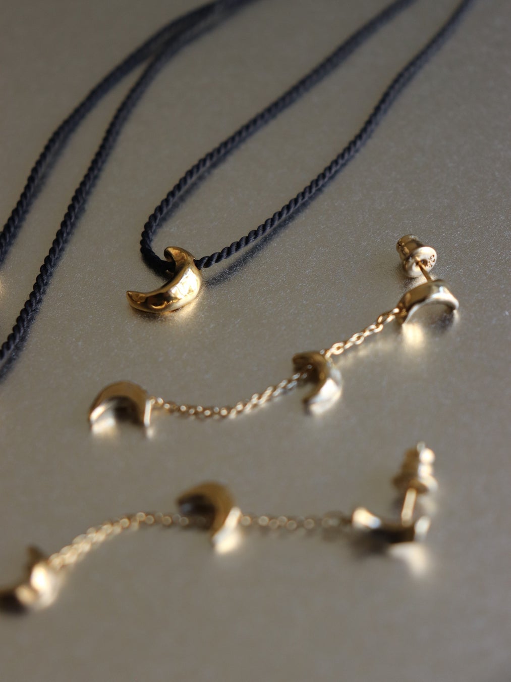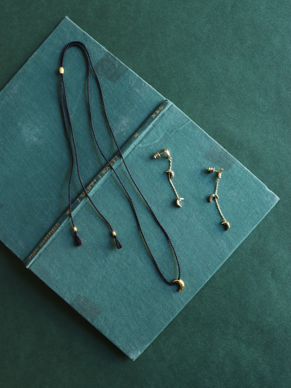 月の光をうけて輝く水面、そこに光りながら広がる波紋を切り取った三日月のようなモチーフが魅力のシルクコードネックレスが発売になりました。甘すぎず、大人の女性が着けやすいニュアンスがあります。