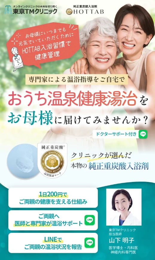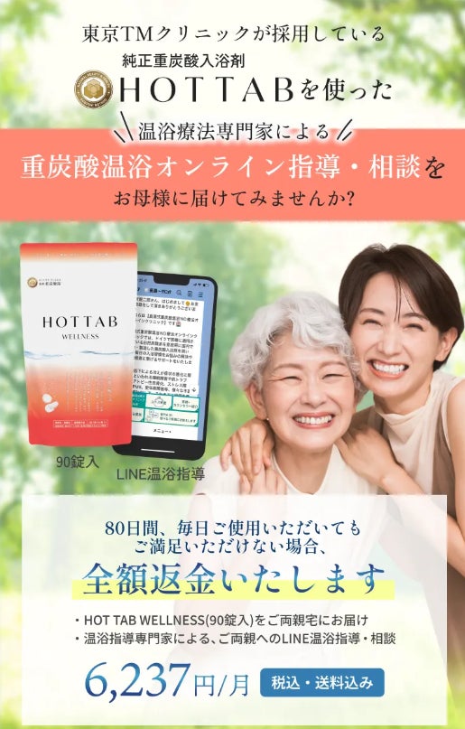 東京TMクリニック(所在地:東京都渋谷区、代表医師:林田泰斗)は、純正重炭酸入浴剤「ホットタブ」の開発者で発明者でもある小星重治氏が代表取締役を務める株式会社ホットタブとコラボし、「重炭酸温浴」を通じて、離れて暮らすご両親の健康やフレイル防止にお子様が関心をもち、ご両親と協力して病気にならない健康づくりが国民運動として広まれば、明るい社会が生まれるのではないか との思いから、このたび、全国の母親やぎ両親の健康と若さをさらに高めるために、母の日をきっかけにご両親へ『おうち温泉健康湯治(ドクターサポート付き)』を贈るキャンペーンを開始いたします。
