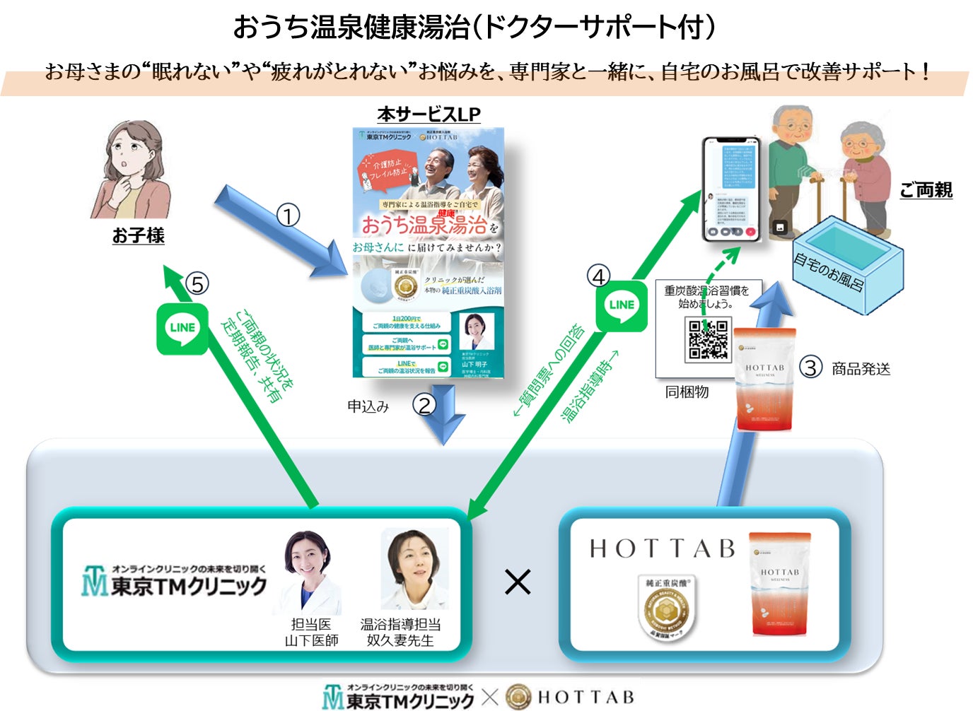 お子様を通じご両親に健康つくりをお届けする、新しい医療サービスです。ご両親宅のお風呂を湯治場として、東京TMクリニックがその効果を認めた純正重炭酸入浴剤「ホットタブ」(株式会社ホットタブ製)をお子様を通じご両親宅へお届け、ご両親は、お子様を通じて、医師および専門の温浴指導士によるLINEでの重炭酸温浴指導・健康相談・診療を受けることができます。