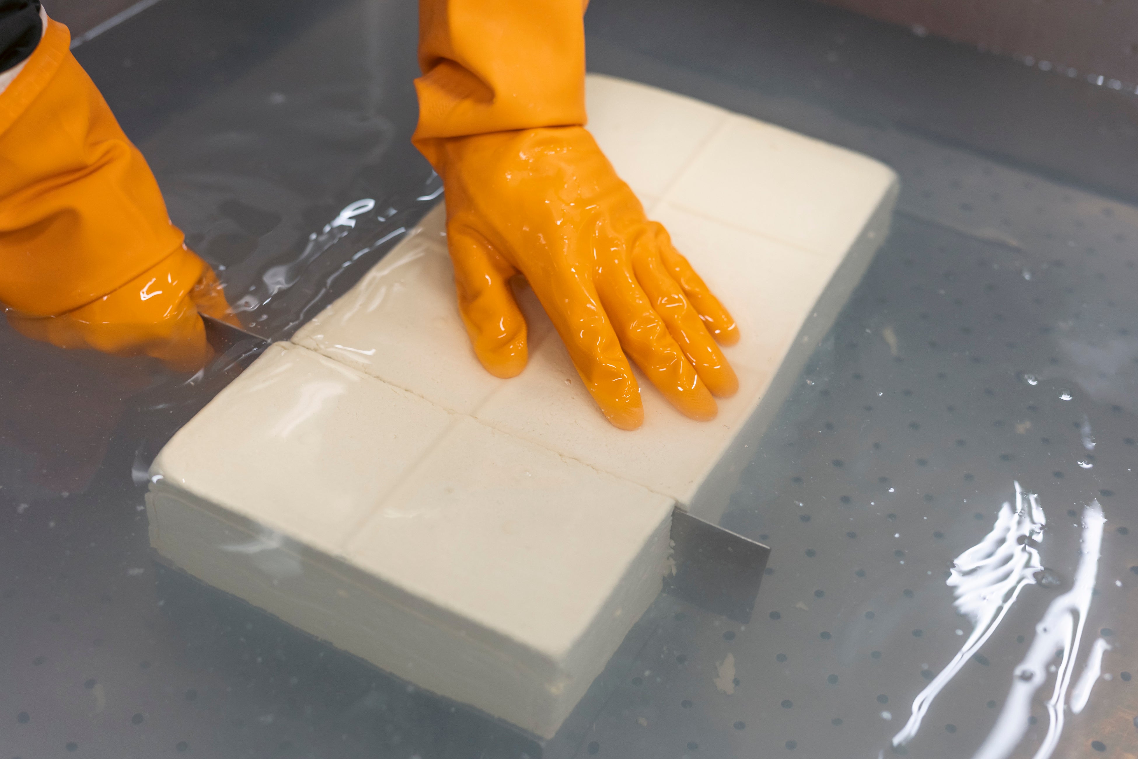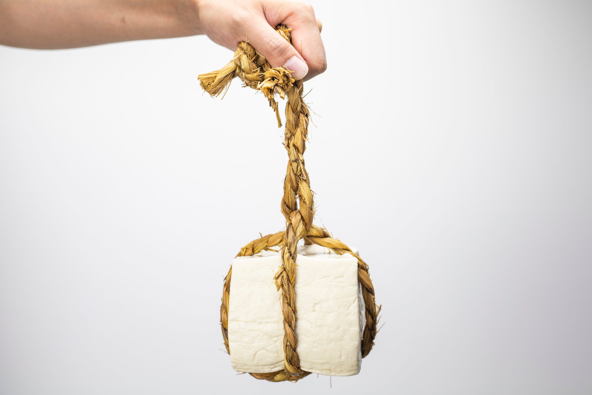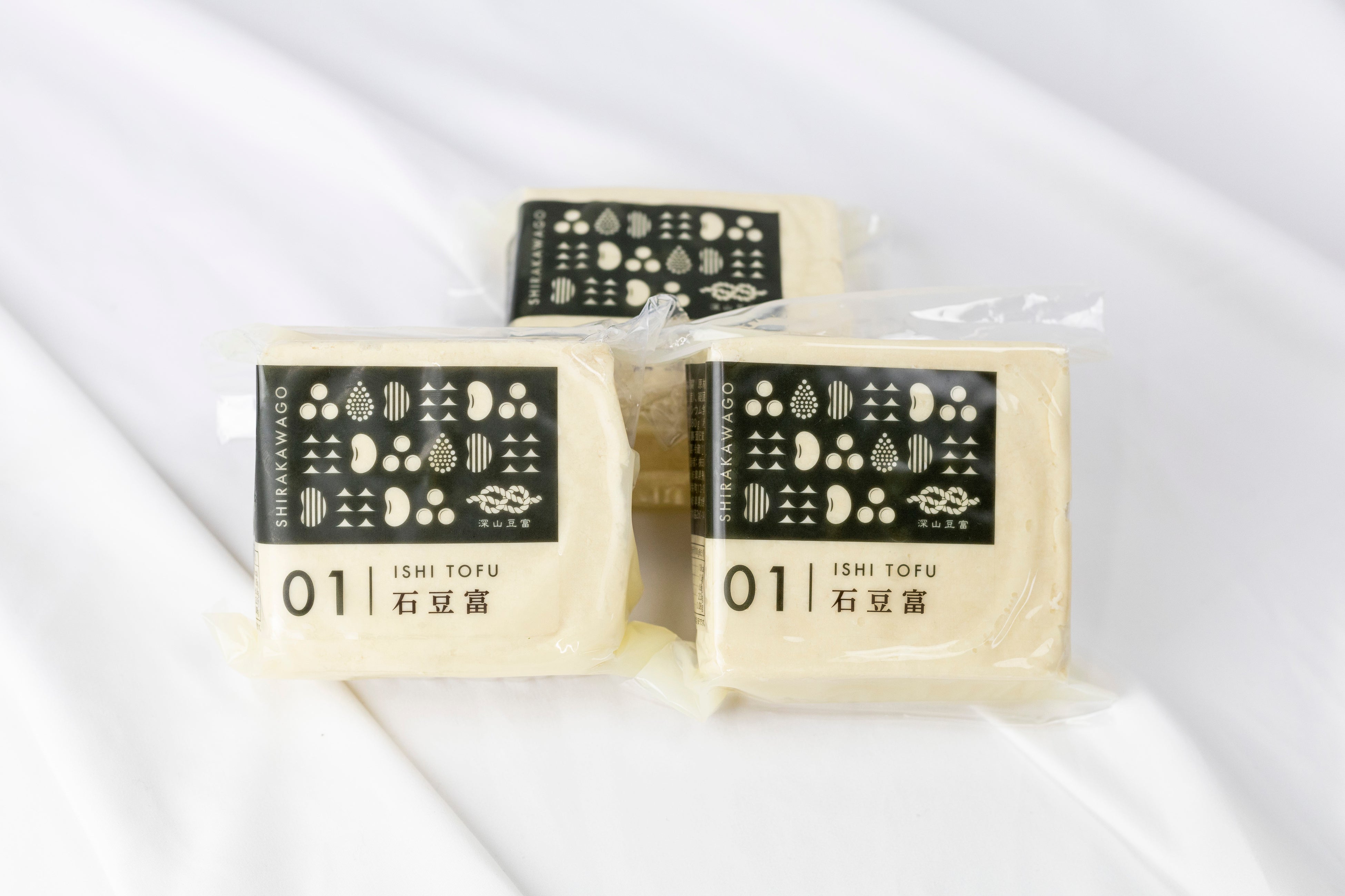 白川郷で古くから食べられてきた堅い仕上がりの木綿豆腐です。一般的な木綿豆腐よりも約2.5倍の大豆を使い、強く押し固めることにより、縄で縛っても崩れないほど堅い『石豆富』が完成します。大豆の使用量が多いことから、たんぱく質を始めとする栄養価が多く、かつては雪に閉ざされた豪雪地帯の白川郷では貴重なたんぱく源として大切にされていました。堅い仕上がりであることから、さまざまな調理に使いやすい『石豆富』。現代においても、たんぱく質を手軽に摂れる食材として肉や魚に次ぐ主食にもなり得る可能性を秘めています。