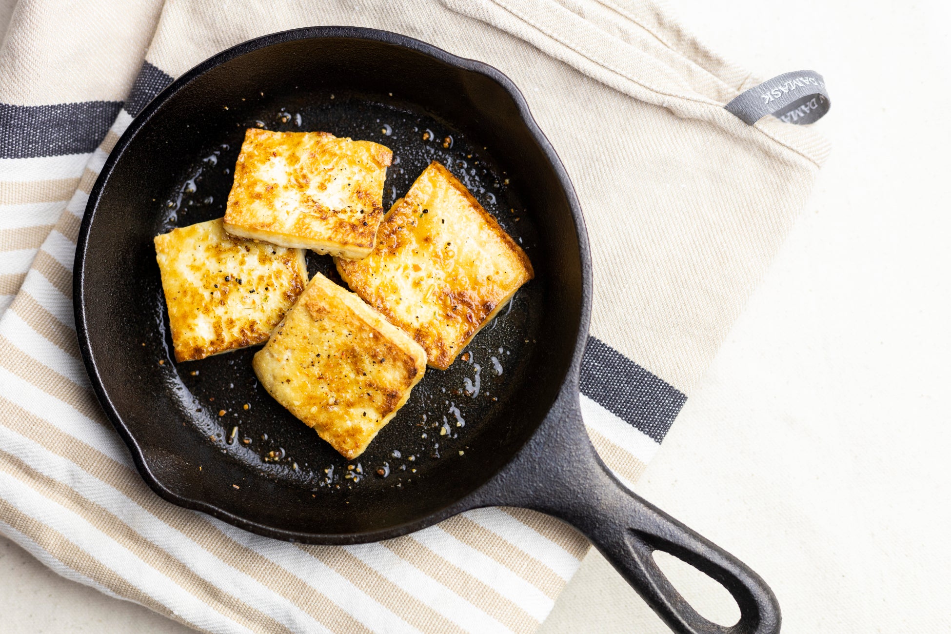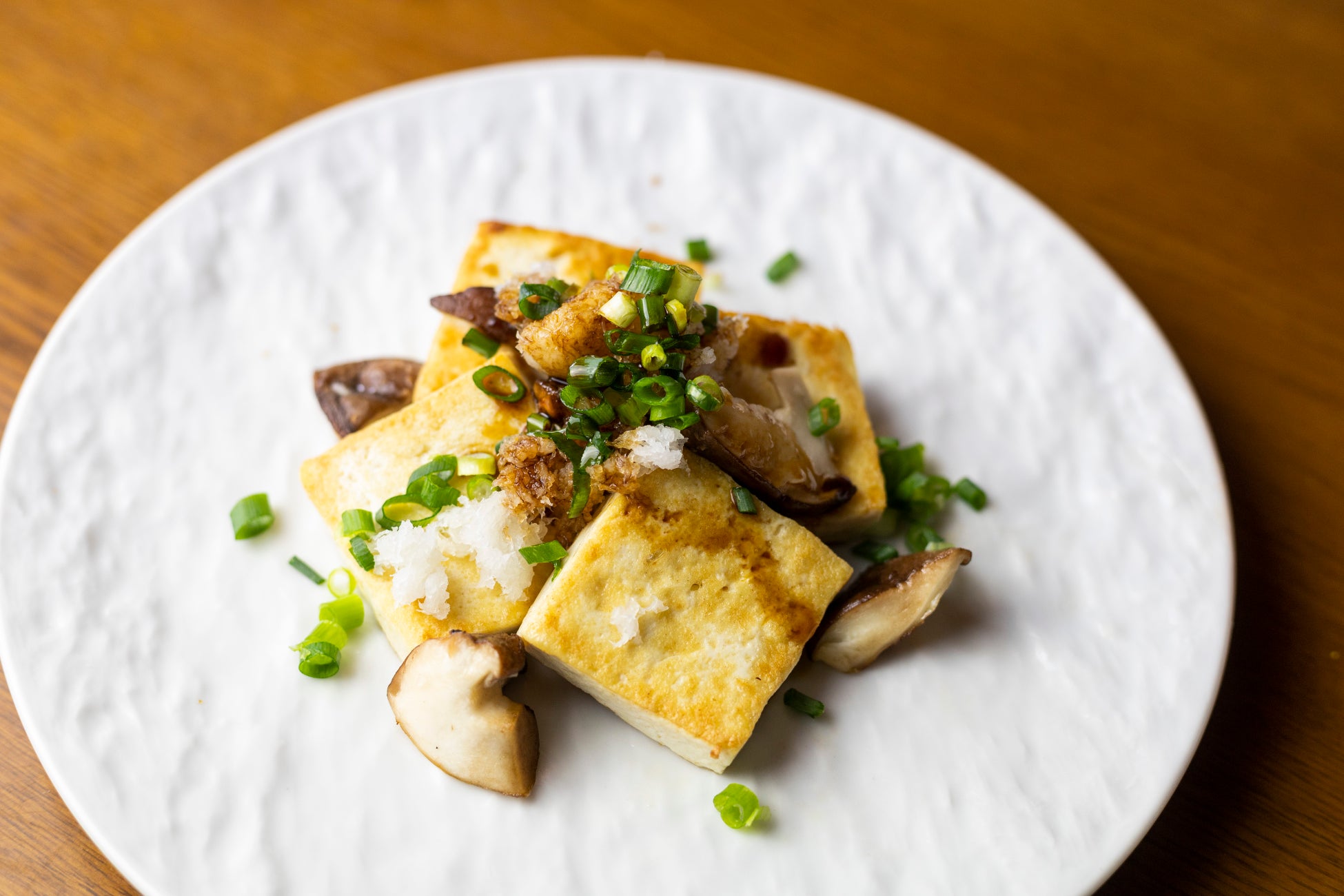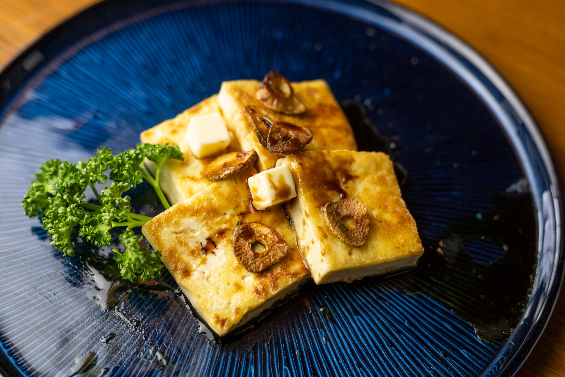 石豆富は、その堅さから、焼く・炒める・揚げるなど、どんな調理方法にも向いています。白川郷の位置する飛騨地域では、豆腐ステーキが名物として知られており、石豆富は特に豆腐ステーキに向いている食材です。その理由は、石豆富の調理のしやすさ。石豆富は製造工程で水分をしっかりと抜いるため、調理する際の水切りは不要です。お好きな厚みにスライスして、多めの油でじっくり焼くだけで、外はカリっと中はふわっとした石豆富ステーキが完成します。