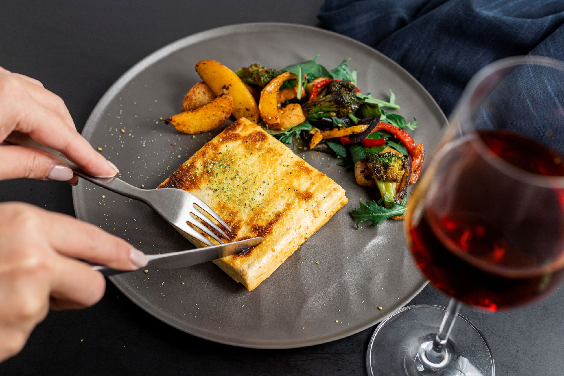 レア、ミディアムレア、ウェルダン…焼き加減はお好みで、ナイフとフォークで召し上がれ。お肉のように楽しむ石豆富ステーキ