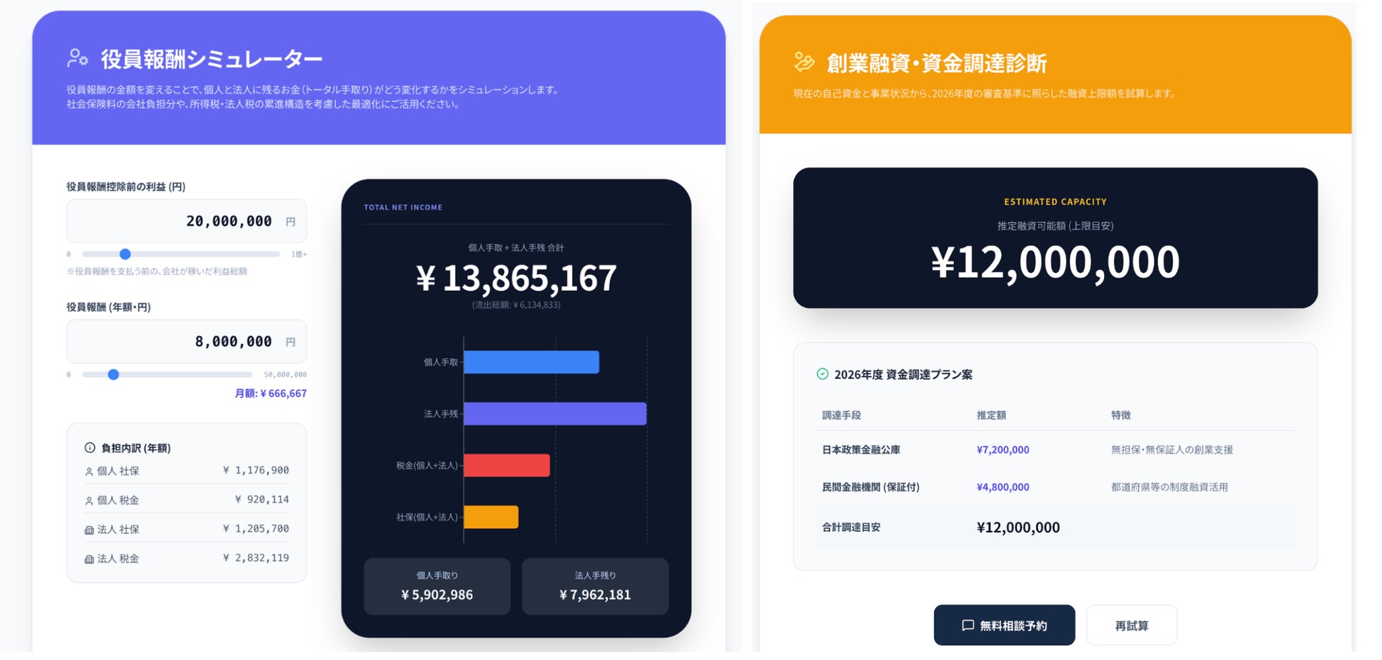 税金や役員報酬のシミュレーション、融資・補助金・助成金の受給可能性診断といった財務・労務に関するツールから、PDF編集や画像圧縮などの日常業務に役立つITツールまで、経営に直結する多彩なツールを無料で解放しています。
