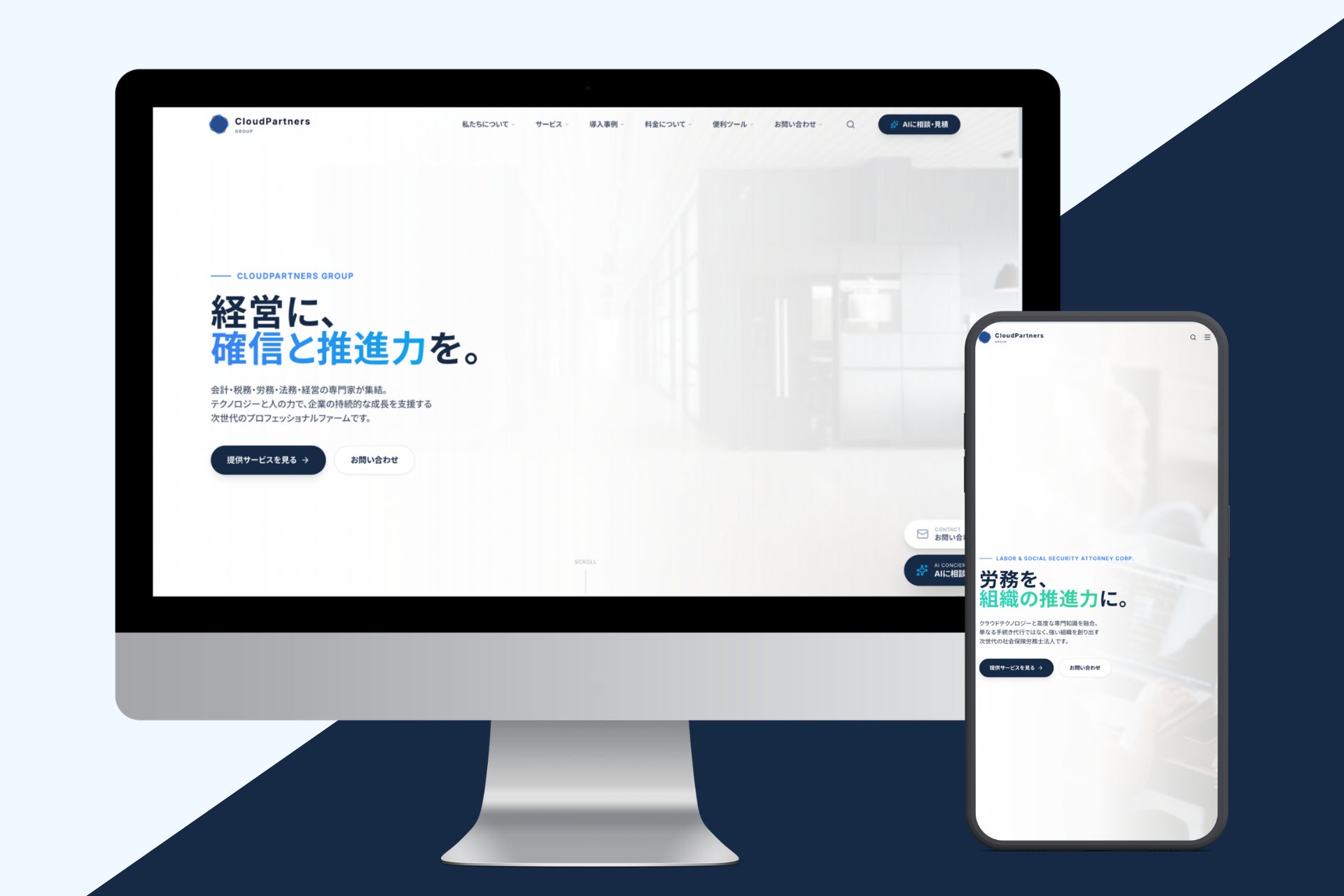 企業の資金調達、バックオフィスDX、そしてAI技術の社会実装を包括的に支援するクラウドパートナーズグループ(本社:東京都千代田区、代表:村井 隆紘)は、当グループを構成する「税理士法人クラウドパートナーズ」「社会保険労務士法人クラウドパートナーズ」「株式会社クラウドパートナーズ」「株式会社AIパートナーズ」の4法人の提供価値を統合し、シームレスな経営課題解決を提供する新たなコーポレートサイト( https://cloudpartners.jp )を本日より公開いたしました。