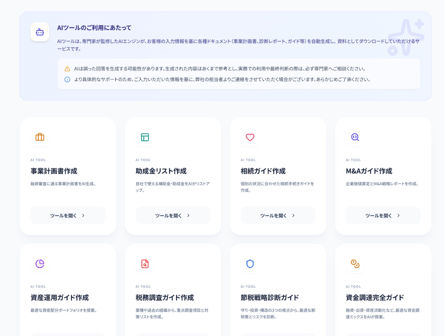 新サイトの公開に伴い、当グループのAI技術と専門家の知見を凝縮した様々な機能や便利ツールを実装・公開いたしました。これらは、旧来の士業サービスの常識を覆し、お客様に圧倒的なスピードと利便性を提供するものです。