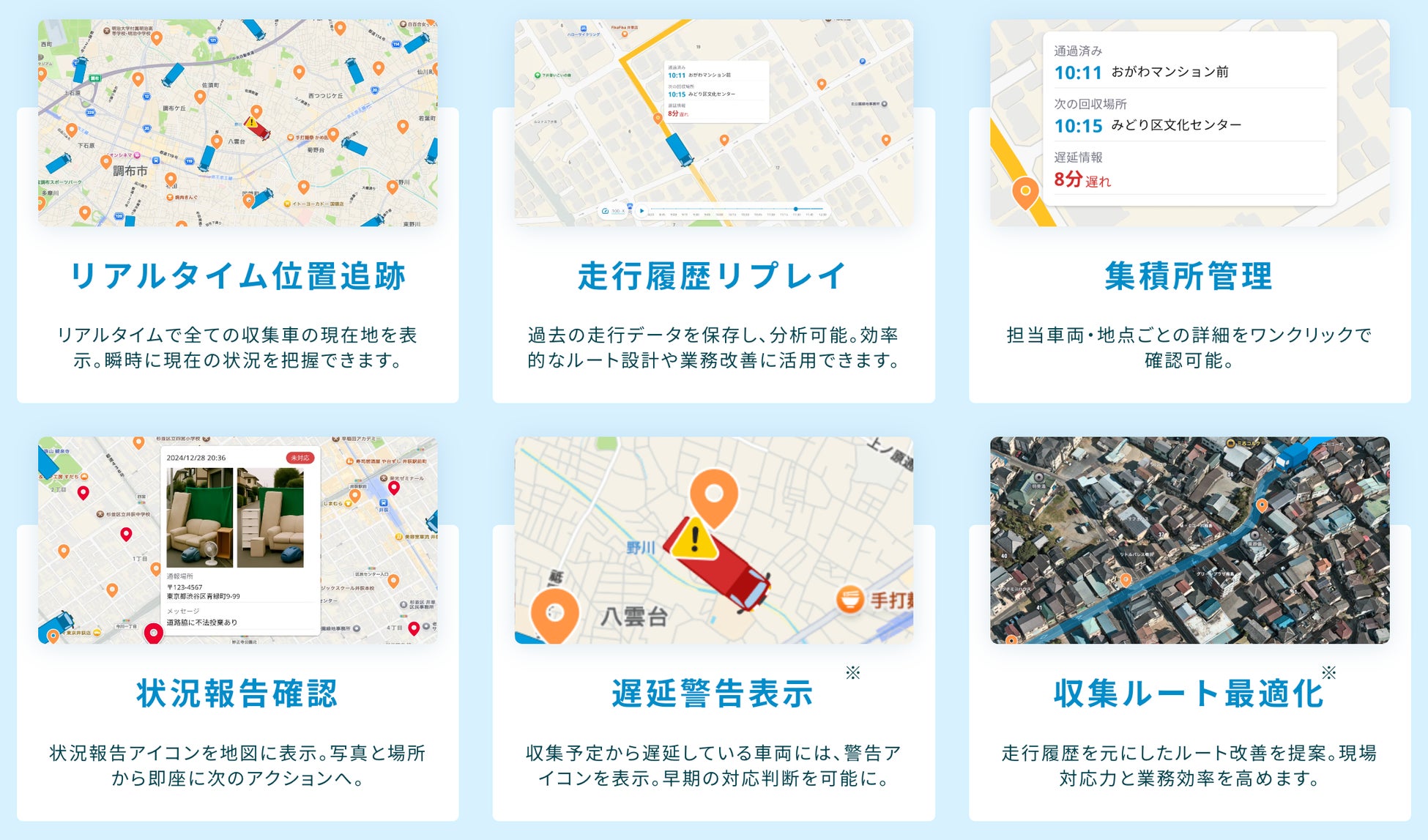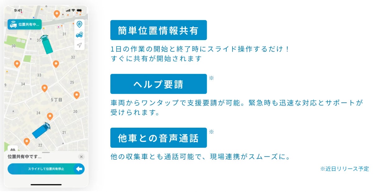 ● 他車両の位置や集積所を地図上で把握し、チーム連携や新人支援に活用可能