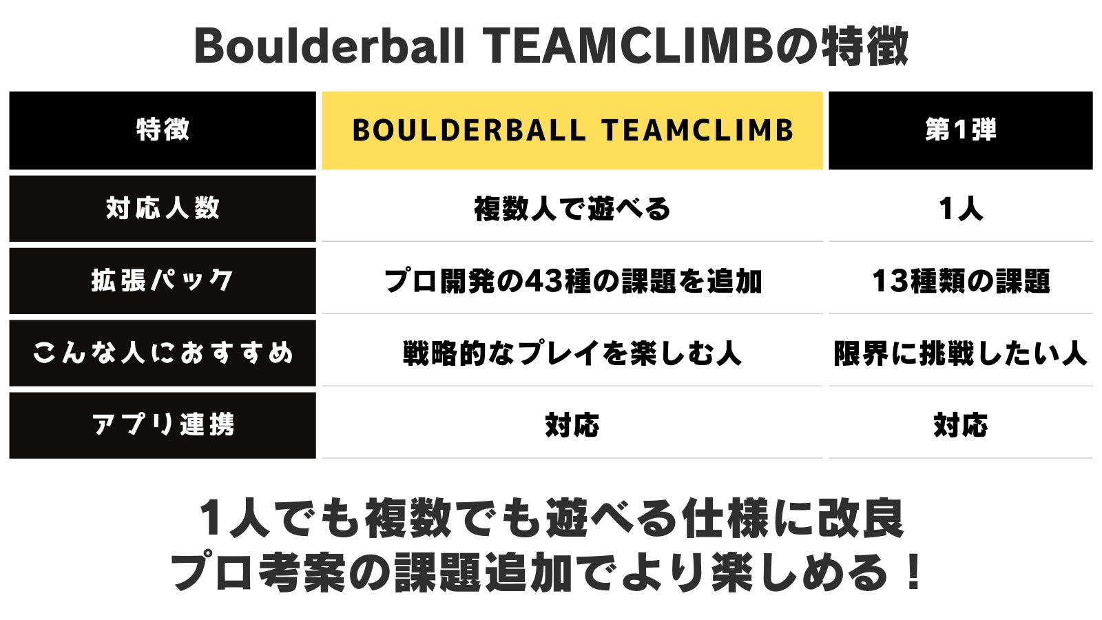 新たに登場したBoulderball TEAM CLIMBは、グループでの使用を想定して設計されています。協力プレイを楽しむことで、仲間との絆を深め、競技的要素も加わった新しい体験を提供します。