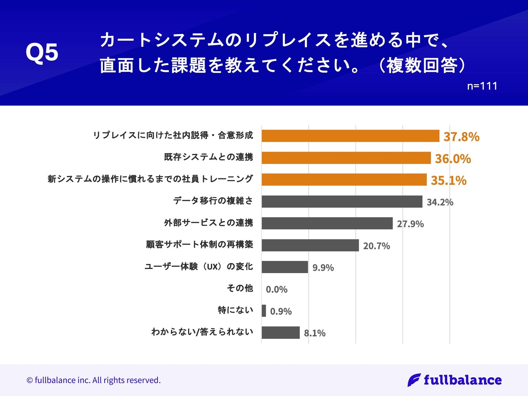 「Q5.カートシステムのリプレイスを進める中で、直面した課題を教えてください。(複数回答)」(n=111)と質問したところ、「リプレイスに向けた社内説得・合意形成」が37.8%、「既存システムとの連携」が36.0%、「新システムの操作に慣れるまでの社員トレーニング」が35.1%という回答となりました。