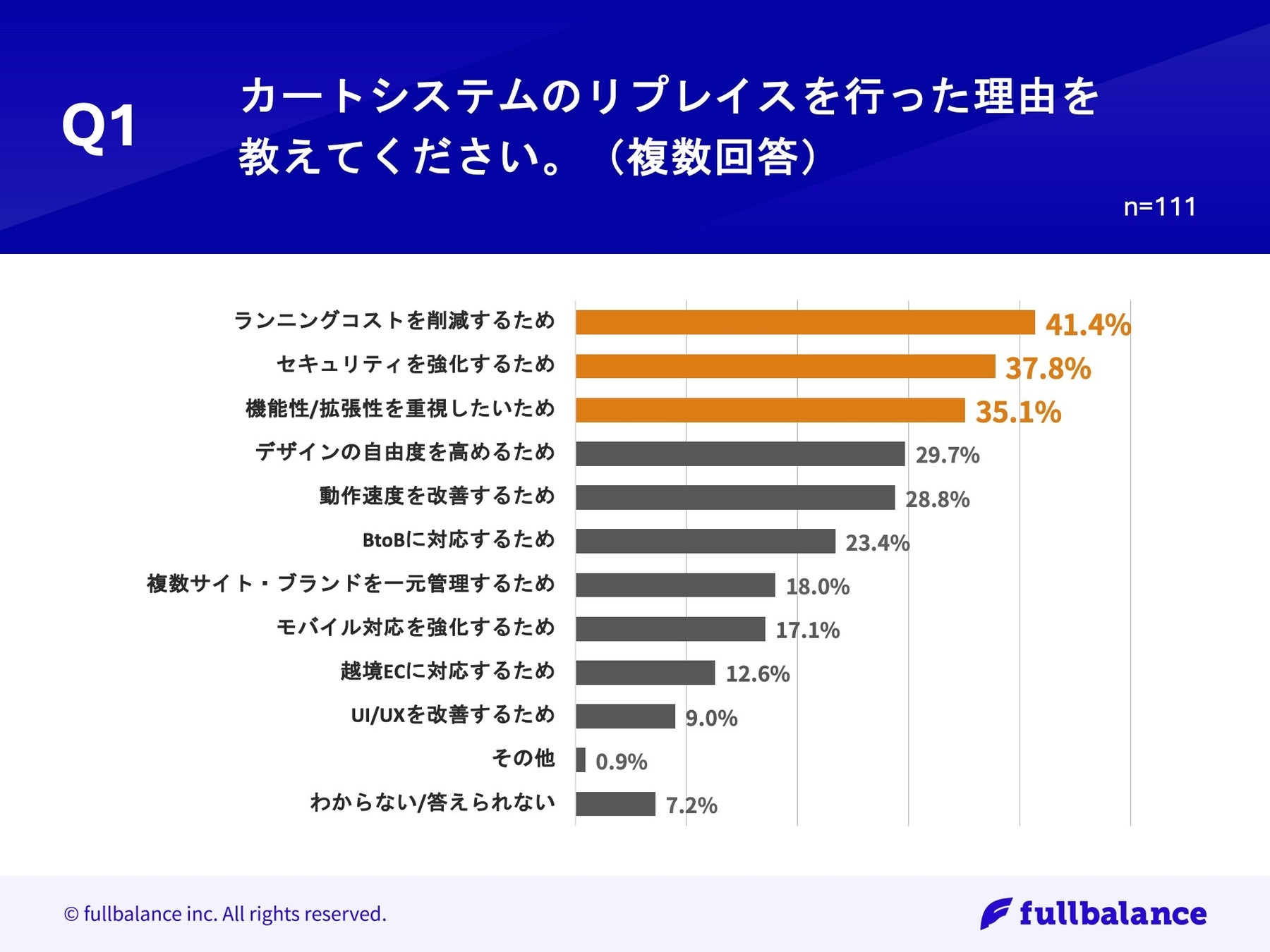 「Q1.カートシステムのリプレイスを行った理由を教えてください。(複数回答)」(n=111)と質問したところ、「ランニングコストを削減するため」が41.4%、「セキュリティを強化するため」が37.8%、「機能性/拡張性を重視したいため」が35.1%という回答となりました。