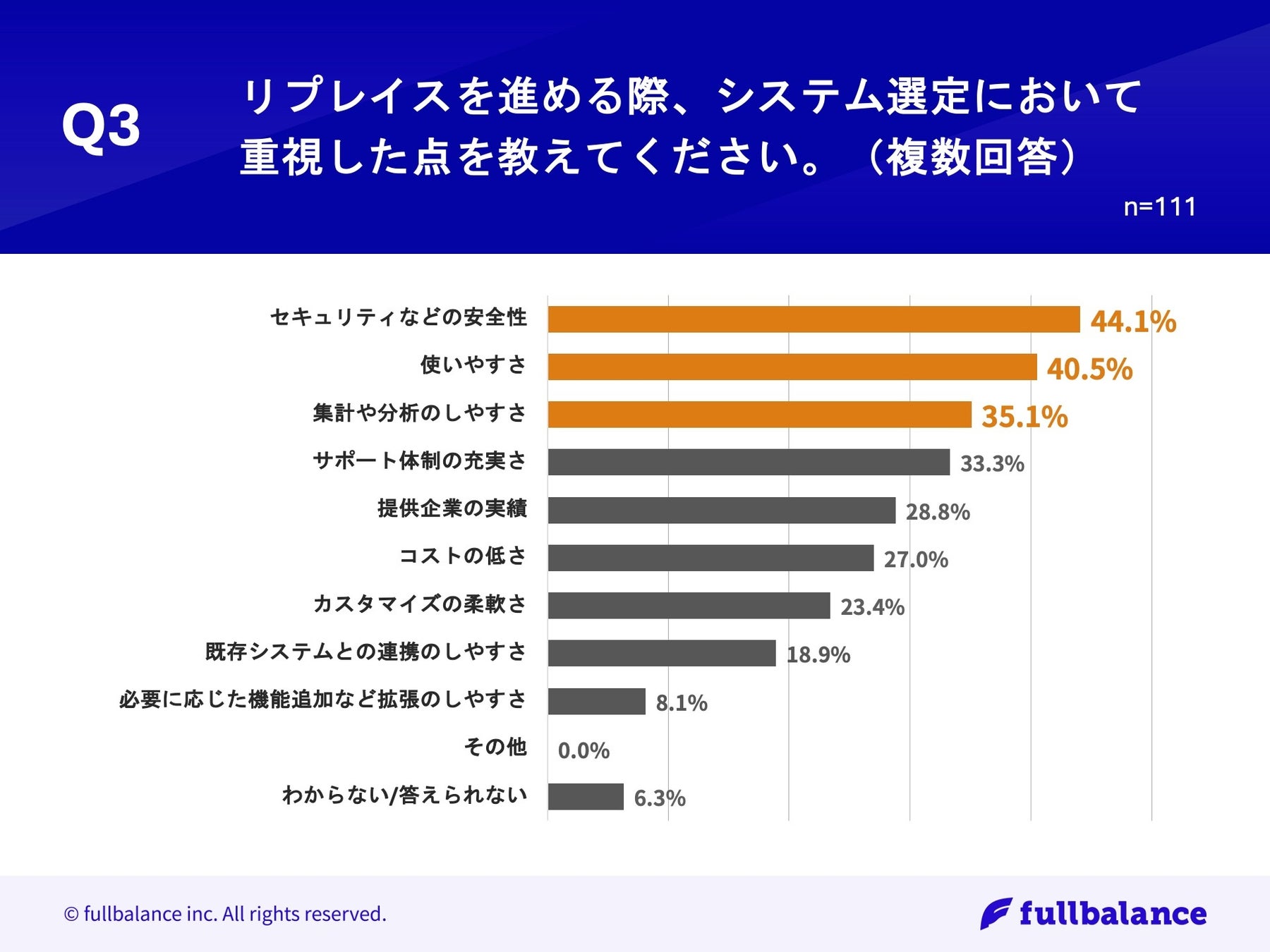 「Q3.リプレイスを進める際、システム選定において重視した点を教えてください。(複数回答)」(n=111)と質問したところ、「セキュリティなどの安全性」が44.1%、「使いやすさ」が40.5%、「集計や分析のしやすさ」が35.1%という回答となりました。
