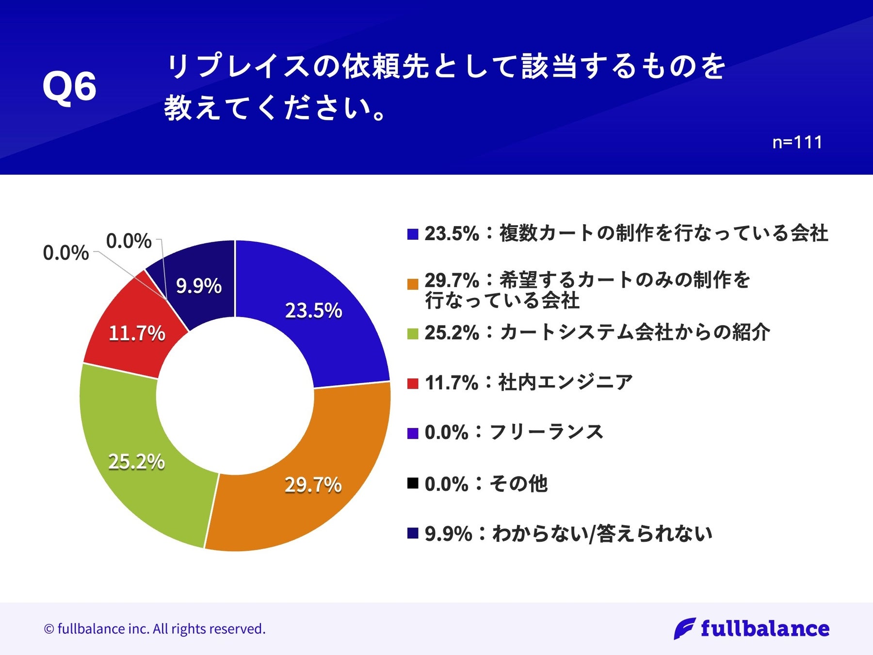 「Q6.リプレイスの依頼先として該当するものを教えてください。」(n=111)と質問したところ、「希望するカートのみの制作を行なっている会社」が29.7%、「カートシステム会社からの紹介」が25.2%という回答となりました。