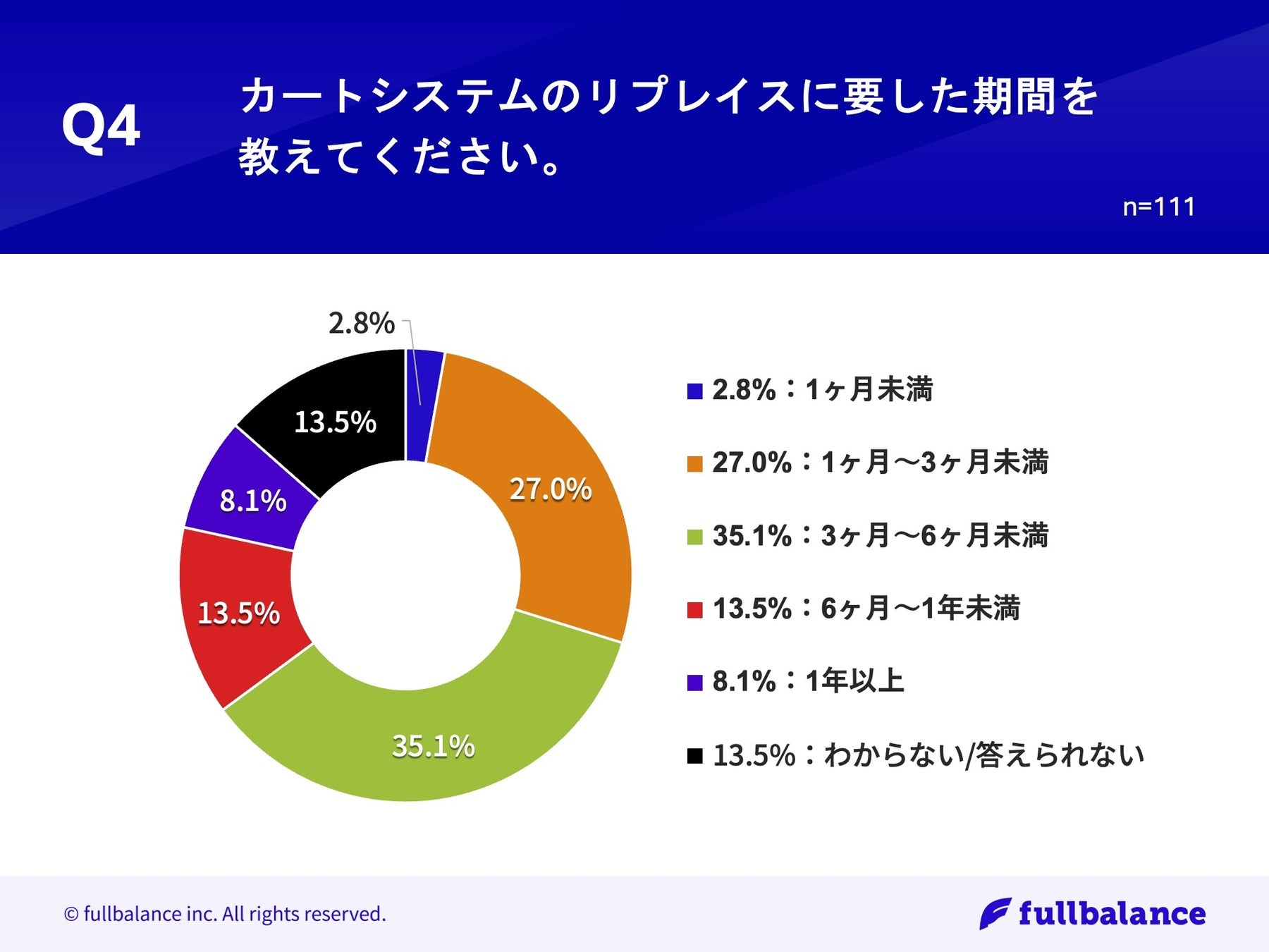 「Q4.カートシステムのリプレイスに要した期間を教えてください。」(n=111)と質問したところ、「3ヶ月〜6ヶ月未満」が35.1%、「1ヶ月~3ヶ月未満」が27.0%という回答となりました。